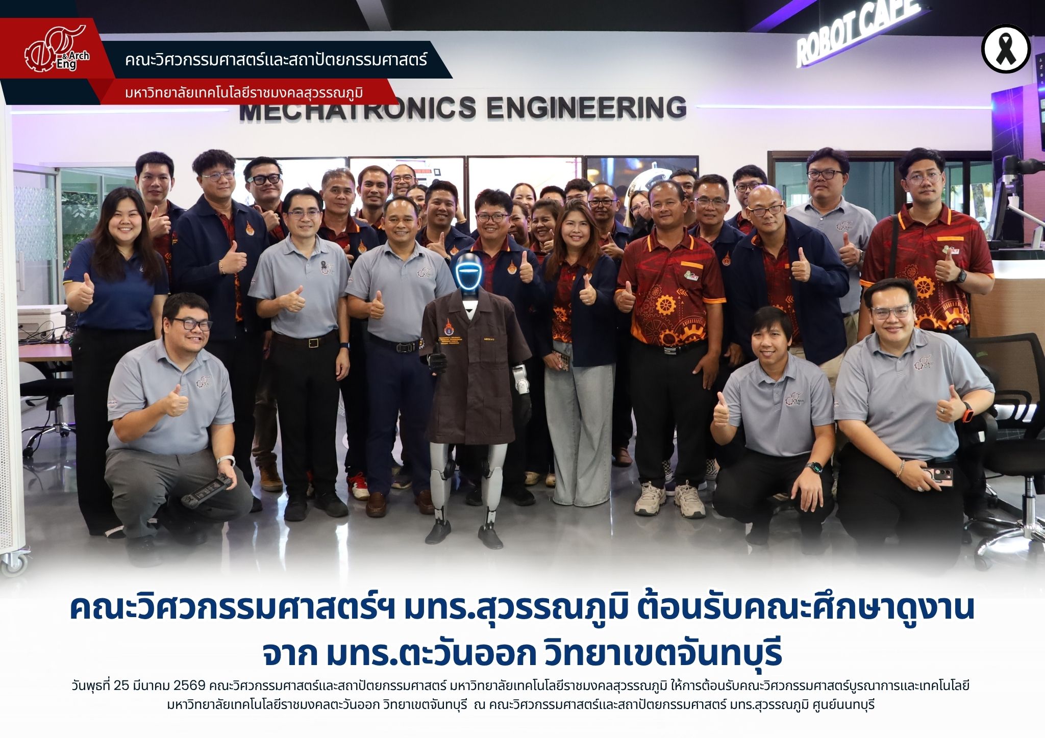 วันพุธที่ 25 มีนาคม 2569 คณะวิศวกรรมศาสตร์และสถาปัตยกรรมศาสตร์ มหาวิทยาลัยเทคโนโลยีราชมงคลสุวรรณภูมิ นำโดย ผู้ช่วยศาสตราจารย์พัชระ กัญจนกาญจน์ คณบดีคณะวิศวกรรมศาสตร์ฯ พร้อมด้วยผู้บริหาร คณาจารย์และเจ้าหน้าที่ ให้การต้อนรับ ผู้ช่วยศาสตราจารย์ ดร.ประหยัด กองสุข คณบดีคณะวิศวกรรมศาสตร์บูรณาการและเทคโนโลยี มหาวิทยาลัยเทคโนโลยีราชมงคลตะวันออก วิทยาเขตจันทบุรี พร้อมด้วยผู้บริหาร คณาจารย์ และเจ้าหน้าที่ ในโอกาสเข้าศึกษาดูงานณ คณะวิศวกรรมศาสตร์และสถาปัตยกรรมศาสตร์ มทร.สุวรรณภูมิ ศูนย์นนทบุรี เพื่อแลกเปลี่ยนประสบการณ์และแนวทางการบริหารจัดการห้องปฏิบัติการให้เหมาะสมกับรูปแบบการเรียนการสอนในปัจจุบัน ทั้งในด้านเครื่องมือ อุปกรณ์ และการจัดสภาพแวดล้อมที่เอื้อต่อการเรียนรู้ของนักศึกษา