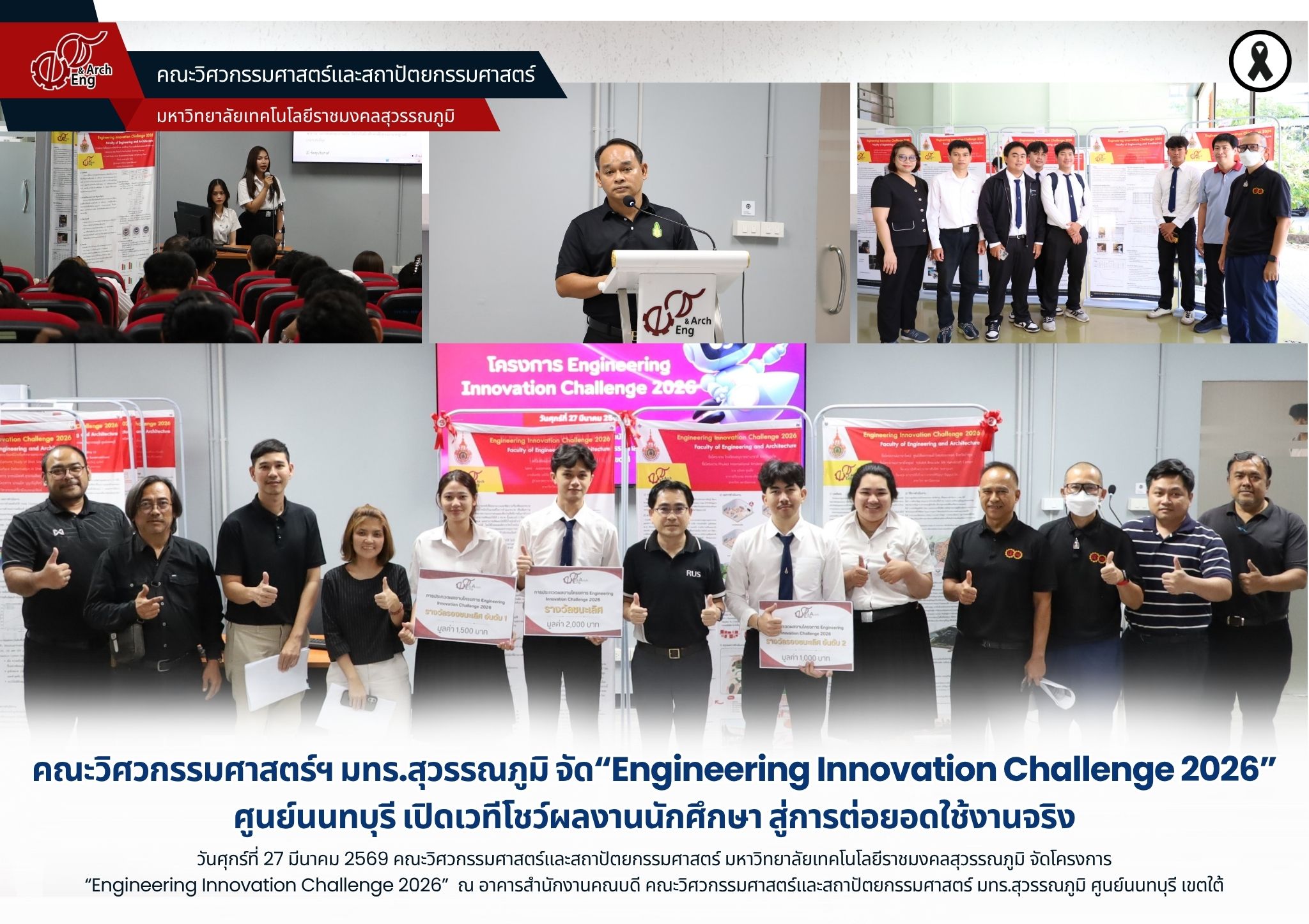 วันศุกร์ที่ 27 มีนาคม 2569 คณะวิศวกรรมศาสตร์และสถาปัตยกรรมศาสตร์ มหาวิทยาลัยเทคโนโลยีราชมงคลสุวรรณภูมิ จัดโครงการ “Engineering Innovation Challenge 2026” ณ อาคารสำนักงานคณบดี คณะวิศวกรรมศาสตร์และสถาปัตยกรรมศาสตร์ มทร.สุวรรณภูมิ ศูนย์นนทบุรี เขตใต้ โดยมี ผู้ช่วยศาสตราจารย์พัชระ กัญจนกาญจน์ คณบดีคณะวิศวกรรมศาสตร์ฯ เป็นประธานเปิดโครงการ เพื่อเปิดพื้นที่ให้นักศึกษาได้นำเสนอผลงานโครงงานและวิทยานิพนธ์ต่ออาจารย์ที่ปรึกษาและคณาจารย์ พร้อมรับข้อเสนอแนะเพื่อนำไปปรับปรุงพัฒนาผลงานให้มีคุณภาพยิ่งขึ้น อีกทั้งยังเป็นเวทีให้นักศึกษาได้แสดงความคิดสร้างสรรค์ และนำความรู้ที่ได้จากการเรียนมาประยุกต์ใช้กับสถานการณ์จริง นอกจากนี้ ยังส่งเสริมให้นักศึกษานำผลงานไปต่อยอดทั้งในด้านการใช้งานจริง การศึกษาวิจัยในระดับที่สูงขึ้น รวมถึงการพัฒนาเป็นนวัตกรรมที่สามารถนำไปใช้ประโยชน์ต่อสังคมและชุมชนได้ในอนาคต