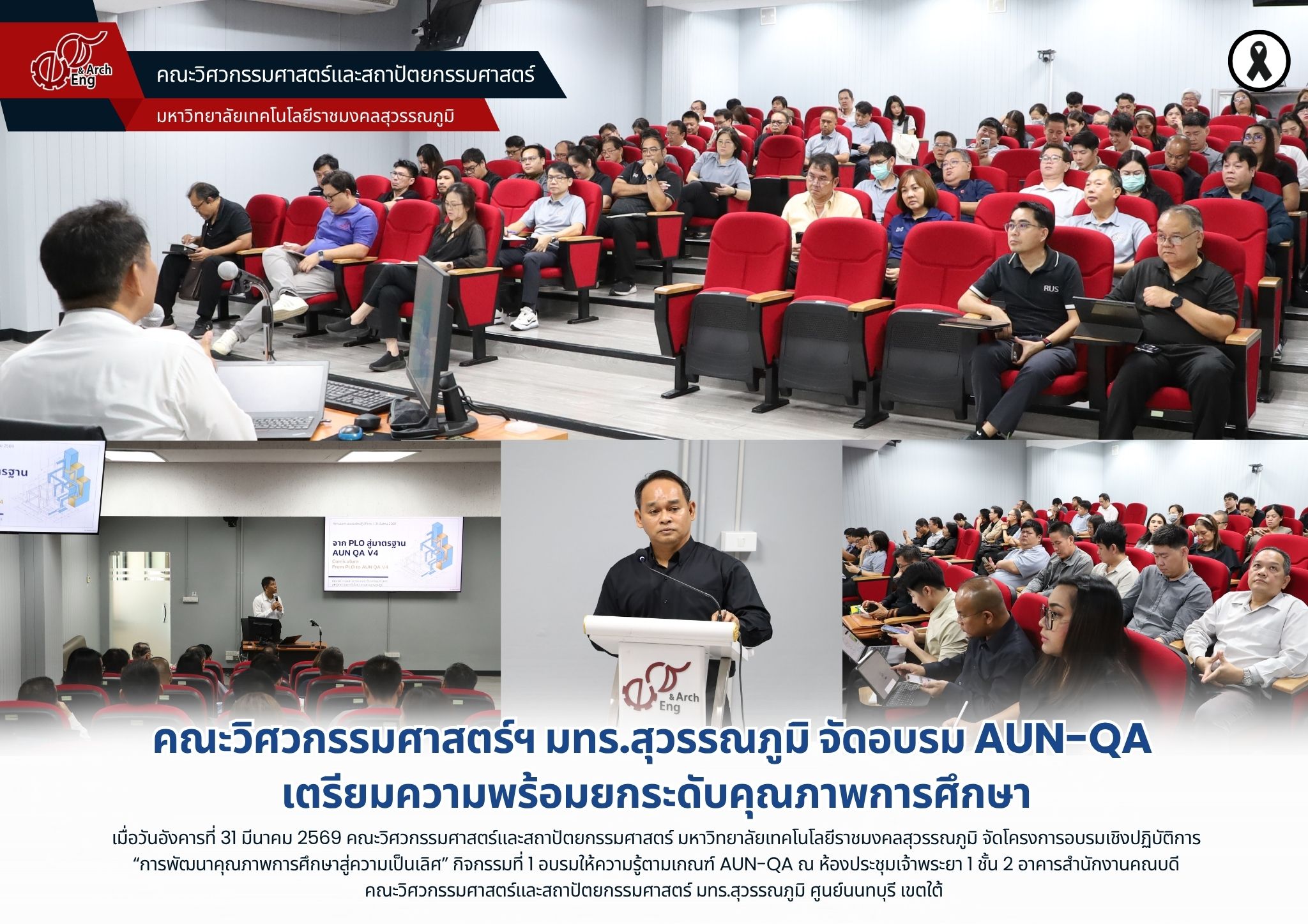 เมื่อวันอังคารที่ 31 มีนาคม 2569 คณะวิศวกรรมศาสตร์และสถาปัตยกรรมศาสตร์ มหาวิทยาลัยเทคโนโลยีราชมงคลสุวรรณภูมิ จัดโครงการอบรมเชิงปฏิบัติการ “การพัฒนาคุณภาพการศึกษาสู่ความเป็นเลิศ” กิจกรรมที่ 1 อบรมให้ความรู้ตามเกณฑ์ AUN-QA ณ ห้องประชุมเจ้าพระยา 1 ชั้น 2 อาคารสำนักงานคณบดี คณะวิศวกรรมศาสตร์และสถาปัตยกรรมศาสตร์ มทร.สุวรรณภูมิ ศูนย์นนทบุรี เขตใต้ โดยมี ผู้ช่วยศาสตราจารย์พัชระ กัญจนกาญจน์ คณบดีคณะวิศวกรรมศาสตร์ฯ เป็นประธานเปิดโครงการ พร้อมทั้งกล่าวถึงความสำคัญของการเตรียมความพร้อมด้านการประกันคุณภาพการศึกษา เพื่อให้การจัดการเรียนการสอนของคณะสอดคล้องกับแนวทางของเครือข่ายมหาวิทยาลัยอาเซียน (AUN-QA) ในการนี้ได้รับเกียรติจาก รองศาสตราจารย์ ดร.บัณฑิต สุขสวัสดิ์ อาจารย์ประจำภาควิชาครุศาสตร์เครื่องกล คณะครุศาสตร์อุตสาหกรรม มหาวิทยาลัยเทคโนโลยีพระจอมเกล้าพระนครเหนือ เป็นวิทยากรถ่ายทอดความรู้เกี่ยวกับการจัดทำผลลัพธ์การเรียนรู้ของหลักสูตร (Program Learning Outcomes: PLO) และการวิเคราะห์ช่องว่าง เพื่อใช้เป็นแนวทางในการปรับปรุงและพัฒนาหลักสูตรให้สอดคล้องกับเกณฑ์ AUN-QA Version 4 ช่วยให้บุคลากรในคณะมีความเข้าใจเกณฑ์ AUN-QA สามารถนำไปประยุกต์ใช้ในการพัฒนาหลักสูตรได้อย่างเหมาะสมและยกระดับคุณภาพการศึกษาของคณะให้สอดคล้องกับมาตรฐานในระดับอาเซียนต่อไป