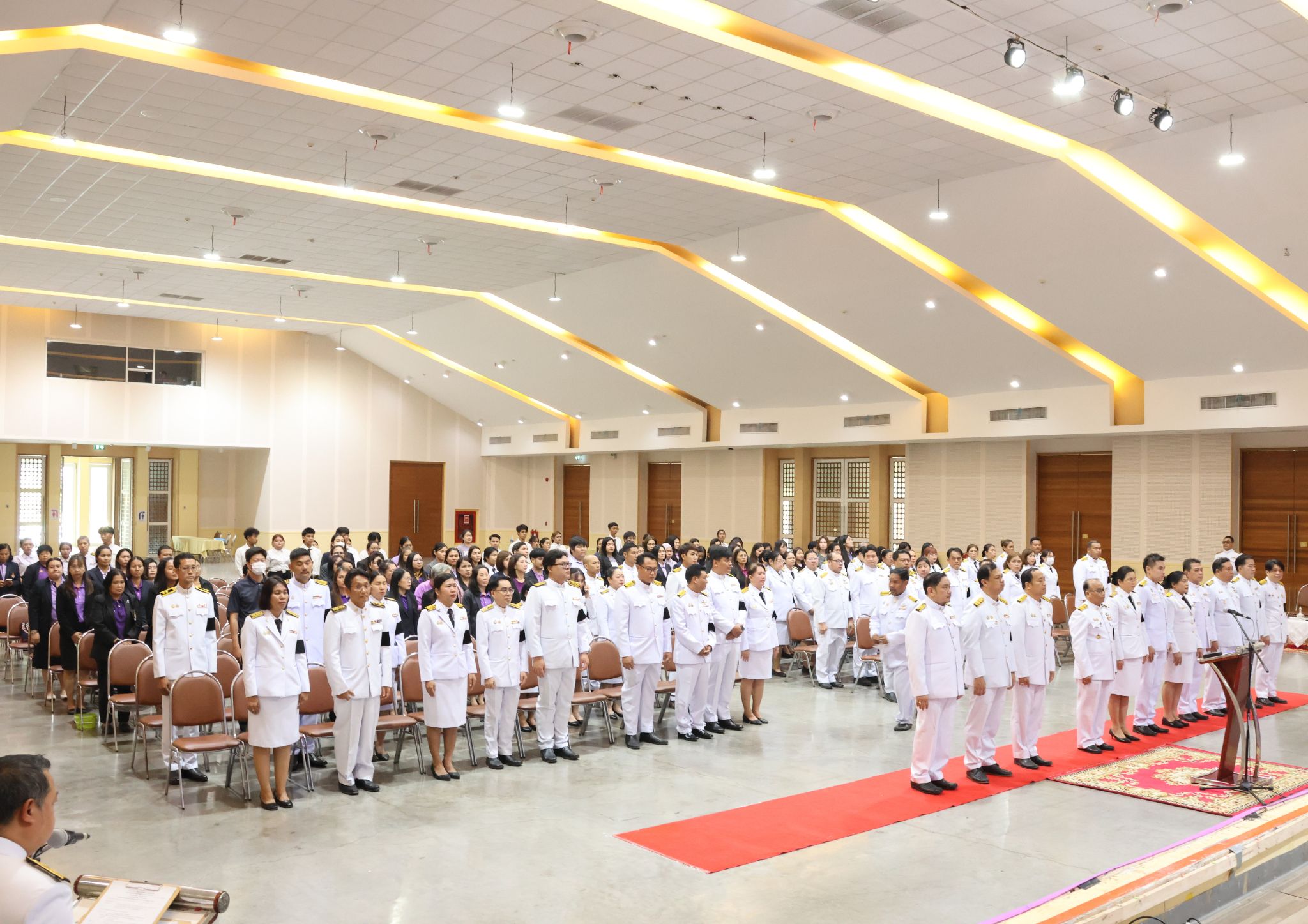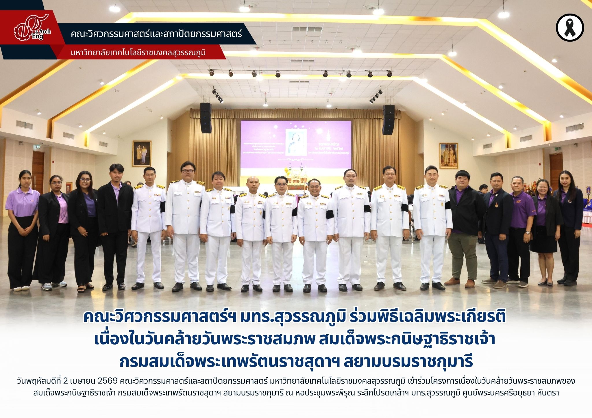 วันพฤหัสบดีที่ 2 เมษายน 2569 คณะวิศวกรรมศาสตร์และสถาปัตยกรรมศาสตร์ มหาวิทยาลัยเทคโนโลยีราชมงคลสุวรรณภูมิ นำโดย ผู้ช่วยศาสตราจารย์พัชระ กัญจนกาญจน์ คณบดีคณะวิศวกรรมศาสตร์ฯ พร้อมด้วยรองคณบดี คณาจารย์ เจ้าหน้าที่ และนักศึกษา เข้าร่วมโครงการเนื่องในวันคล้ายวันพระราชสมภพของ สมเด็จพระกนิษฐาธิราชเจ้า กรมสมเด็จพระเทพรัตนราชสุดาฯ สยามบรมราชกุมารี ณ หอประชุมพระพิรุณ ระลึกโปรดเกล้าฯ มทร.สุวรรณภูมิ ศูนย์พระนครศรีอยุธยา หันตรา ภายในพิธีมีการวางพานพุ่มเงิน พานพุ่มทอง ถวายราชสักการะ และกล่าวถวายราชสดุดี เพื่อแสดงความจงรักภักดีและสำนึกในพระมหากรุณาธิคุณ พร้อมทั้งจัดกิจกรรมทำบุญถวายภัตตาหารแด่พระสงฆ์ และถวายข้าวสารอาหารแห้ง เพื่อความเป็นสิริมงคลแก่ผู้เข้าร่วมงาน