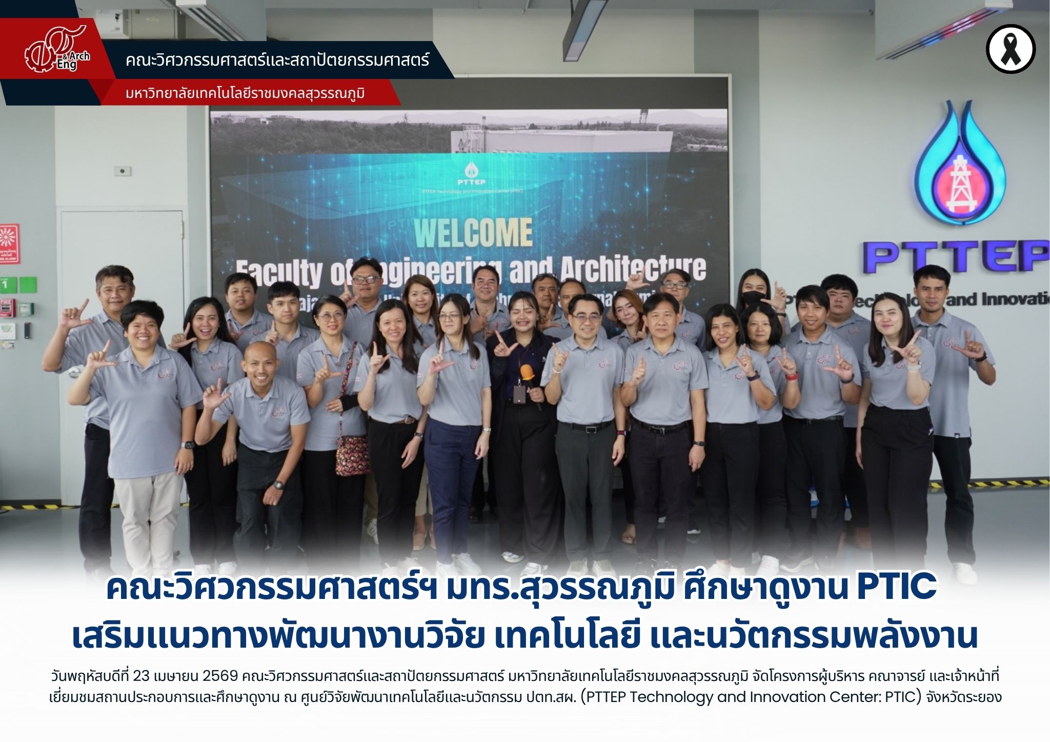 เมื่อวันพฤหัสบดีที่ 23 เมษายน 2569 คณะวิศวกรรมศาสตร์และสถาปัตยกรรมศาสตร์ มหาวิทยาลัยเทคโนโลยีราชมงคลสุวรรณภูมิ จัดโครงการผู้บริหาร คณาจารย์ และเจ้าหน้าที่ เยี่ยมชมสถานประกอบการและศึกษาดูงาน ณ ศูนย์วิจัยพัฒนาเทคโนโลยีและนวัตกรรม ปตท.สผ. (PTTEP Technology and Innovation Center: PTIC) จังหวัดระยอง นำโดย รองศาสตราจารย์ ดร.ยุทธนา กันทะพะเยา รองคณบดี พร้อมด้วยหัวหน้าสาขา คณาจารย์ หัวหน้างาน และเจ้าหน้าที่ เพื่อเปิดมุมมองด้านการพัฒนางานวิจัยและเทคโนโลยีที่สามารถนำไปใช้จริงในภาคอุตสาหกรรม โดยเฉพาะด้านหุ่นยนต์และปัญญาประดิษฐ์ ซึ่งมีบทบาทสำคัญต่อการเพิ่มประสิทธิภาพการทำงานในปัจจุบัน ภายในกิจกรรมผู้เข้าร่วมได้รับฟังการบรรยายและแลกเปลี่ยนประสบการณ์เกี่ยวกับแนวทางการวิจัยและพัฒนาเทคโนโลยีด้านพลังงานสะอาด อาทิ การผลิตไฟฟ้าจากพลังงานแสงอาทิตย์ และแนวคิดการพัฒนาพลังงานรูปแบบใหม่ช่วยเสริมความรู้และประสบการณ์ให้แก่บุคลากร สามารถนำไปต่อยอดในการเรียนการสอนและพัฒนางานวิจัยของคณะให้สอดคล้องกับทิศทางของภาคอุตสาหกรรมต่อไป