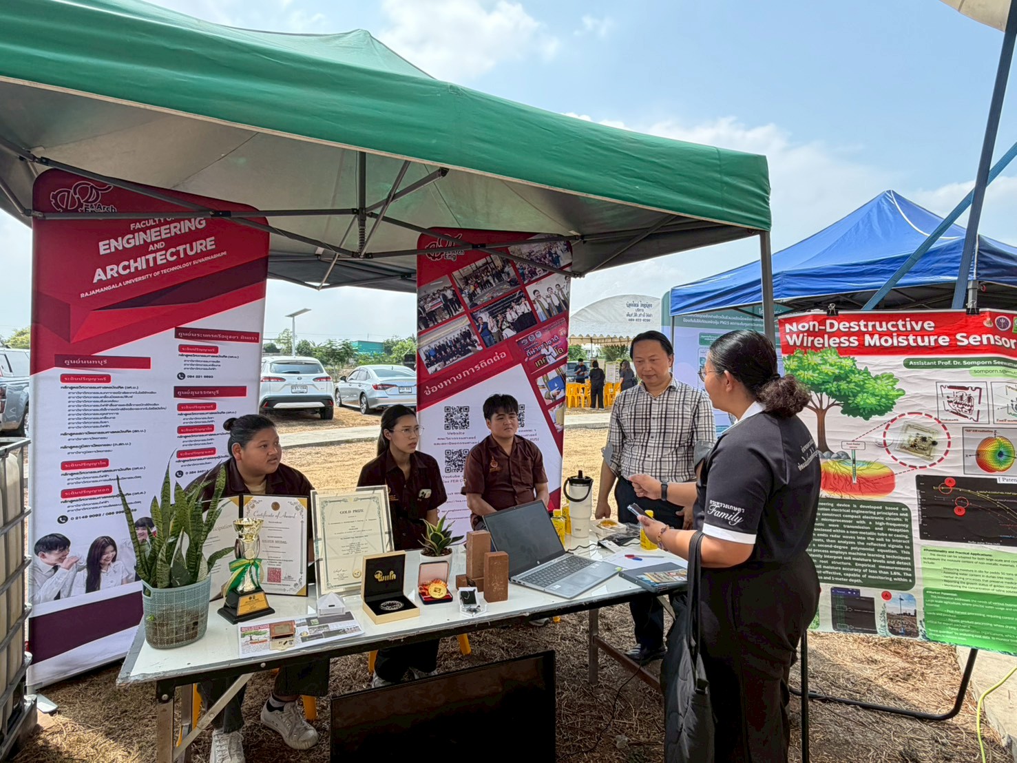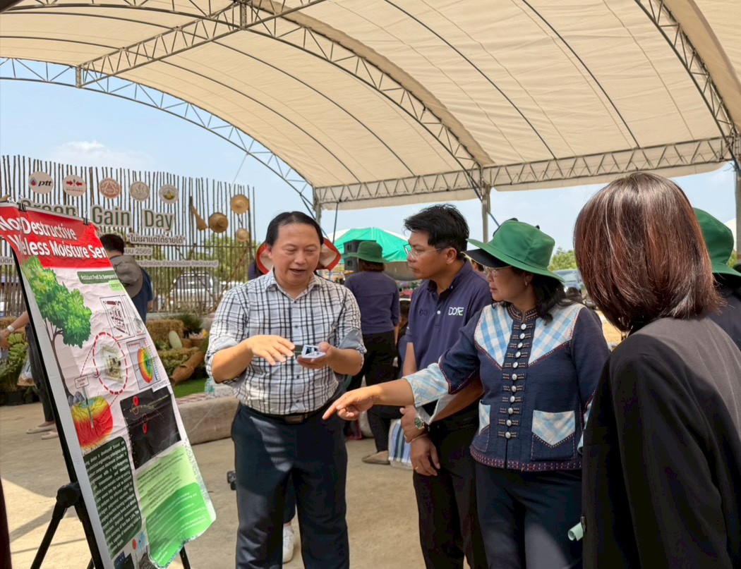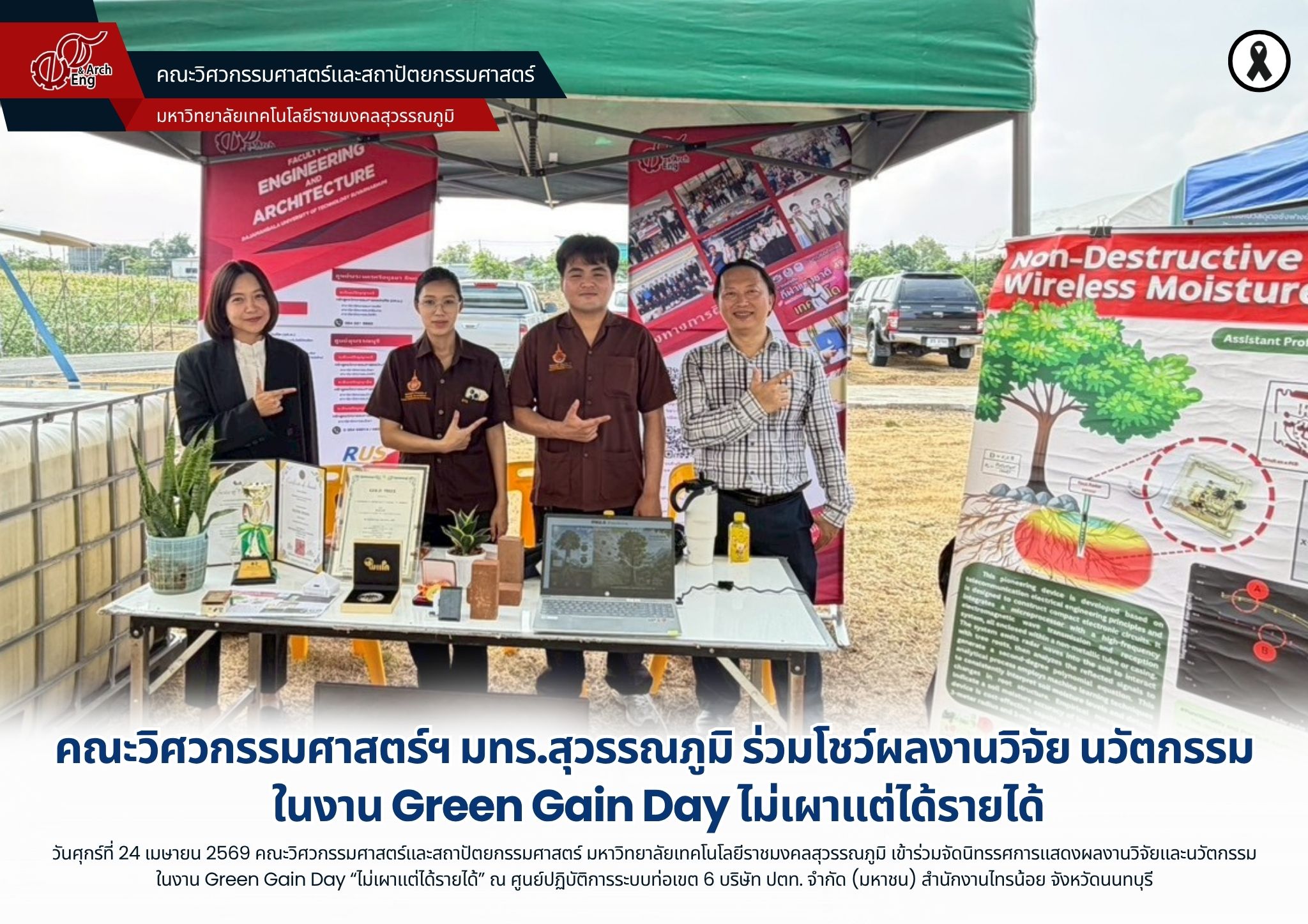 เมื่อวันศุกร์ที่ 24 เมษายน 2569 คณะวิศวกรรมศาสตร์และสถาปัตยกรรมศาสตร์ มหาวิทยาลัยเทคโนโลยีราชมงคลสุวรรณภูมิ นำโดย อาจารย์เมติญา ไถเหี้ยม ผู้ช่วยคณบดี และผู้ช่วยศาสตราจารย์ ดร.สมพร ศรีวัฒนพล พร้อมด้วยนักศึกษาสาขาวิชาวิศวกรรมไฟฟ้าสื่อสารและอิเล็กทรอนิกส์อัจฉริยะ เข้าร่วมจัดนิทรรศการแสดงผลงานวิจัยและนวัตกรรม ในงาน Green Gain Day “ไม่เผาแต่ได้รายได้” โดยมี นางธัญธิตา บุญญมณีกุล รองอธิบดีกรมส่งเสริมการเกษตร เป็นประธานเปิดงาน ณ ศูนย์ปฏิบัติการระบบท่อเขต 6 บริษัท ปตท. จำกัด (มหาชน) สำนักงานไทรน้อย จังหวัดนนทบุรี ภายในงาน คณะฯ ได้นำเสนอผลงานที่ต่อยอดจากปัญหาในภาคการเกษตร โดยมุ่งลดการเผาและเพิ่มมูลค่าวัสดุเหลือใช้ ประกอบด้วย อุปกรณ์วัดความชื้นแบบไร้สายที่ไม่ทำลายวัสดุ การนำตอซังข้าวมาออกแบบเป็นผลิตภัณฑ์เพื่อสร้างมูลค่าเพิ่ม และงานวิจัยการพัฒนาอิฐมอญแบบไม่ต้องเผา โดยใช้เส้นใยฟางข้าวเหลือทิ้งในพื้นที่ภาคกลาง ซึ่งเป็นผลงานของผู้ช่วยศาสตราจารย์ ณฐพงศ์ จันทร์เพ็ชร์ อาจารย์ประจำสาขาวิชาวิศวกรรมโยธา ศูนย์นนทบุรี เพื่อนำองค์ความรู้ด้านวิศวกรรมไปประยุกต์ใช้กับงานเกษตร ช่วยลดการเผาในพื้นที่และเปิดแนวทางให้เกษตรกรสามารถใช้วัสดุที่มีอยู่ให้เกิดประโยชน์มากขึ้น ควบคู่กับการพัฒนาสู่การใช้งานเชิงพาณิชย์ในอนาคต