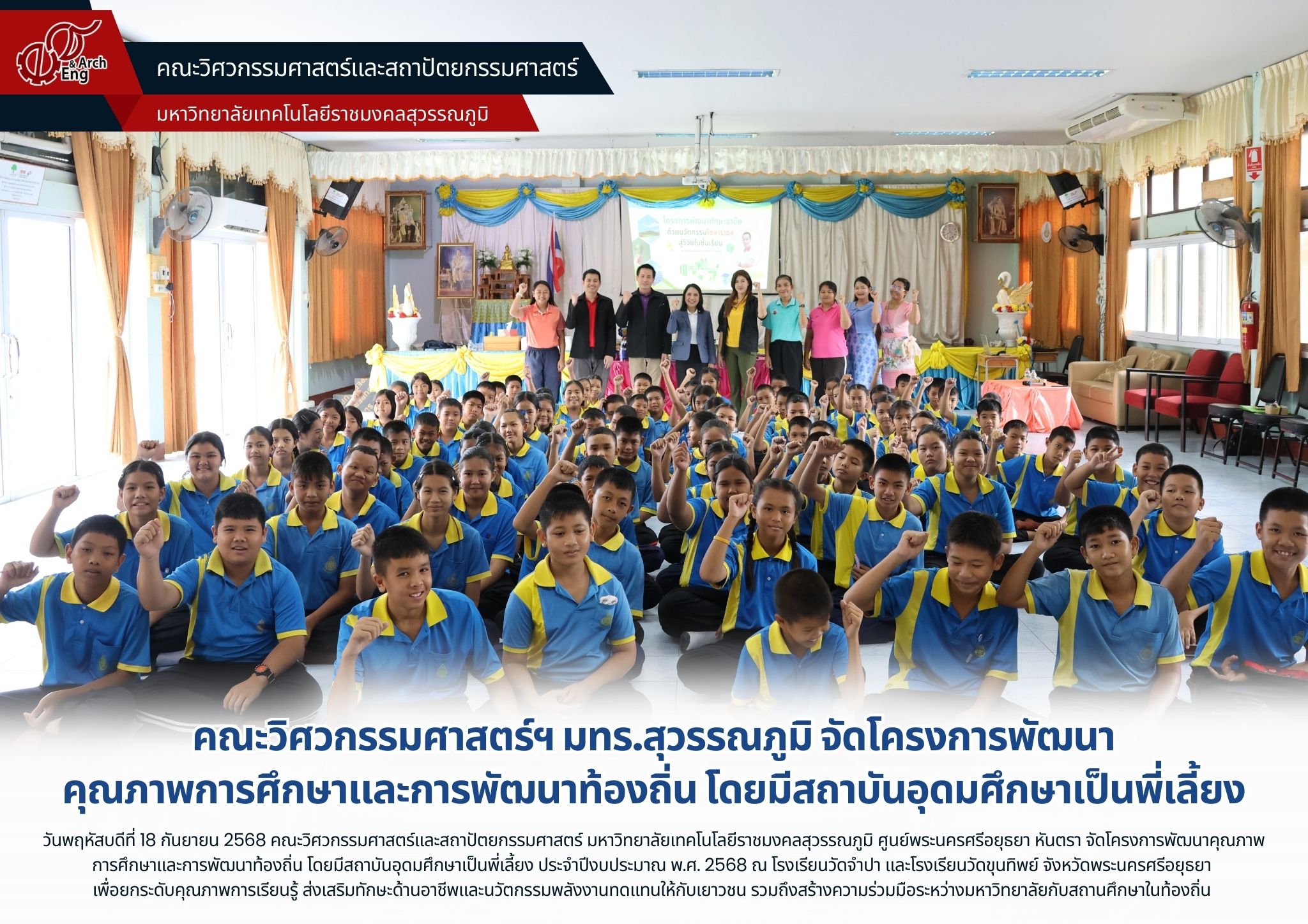 เมื่อวันพฤหัสบดีที่ 18 กันยายน 2568 คณะวิศวกรรมศาสตร์และสถาปัตยกรรมศาสตร์ มหาวิทยาลัยเทคโนโลยีราชมงคลสุวรรณภูมิ ศูนย์พระนครศรีอยุธยา หันตรา จัดโครงการพัฒนาคุณภาพการศึกษาและการพัฒนาท้องถิ่น โดยมีสถาบันอุดมศึกษาเป็นพี่เลี้ยง ประจำปีงบประมาณ พ.ศ. 2568 ณ โรงเรียนวัดจำปา และโรงเรียนวัดขุนทิพย์ จังหวัดพระนครศรีอยุธยา โดย ผู้ช่วยศาสตราจารย์ณัฐชานันท์ อังศุเศรณี รองคณบดีคณะวิศวกรรมศาสตร์ฯ ศูนย์พระนครศรีอยุธยา หันตรา หัวหน้าโครงการ ได้มอบหมายให้ ผู้ช่วยศาสตราจารย์ชัยยันต์ ใจบุญมา และอาจารย์ชาติชาย ลีลาสิริวิไล อาจารย์ประจำสาขาวิชาวิศวกรรมเครื่องกล เป็นวิทยากรบรรยายและถ่ายทอดความรู้ เรื่อง “การพัฒนาทักษะอาชีพด้วยนวัตกรรมโซลาร์เซลล์ สู่การวิจัยในชั้นเรียน” แก่คณะครูและนักเรียนผู้เข้าร่วม เพื่อยกระดับคุณภาพการเรียนรู้ ส่งเสริมทักษะด้านอาชีพและนวัตกรรมพลังงานทดแทนให้กับเยาวชน รวมถึงสร้างความร่วมมือระหว่างมหาวิทยาลัยกับสถานศึกษาในท้องถิ่น
