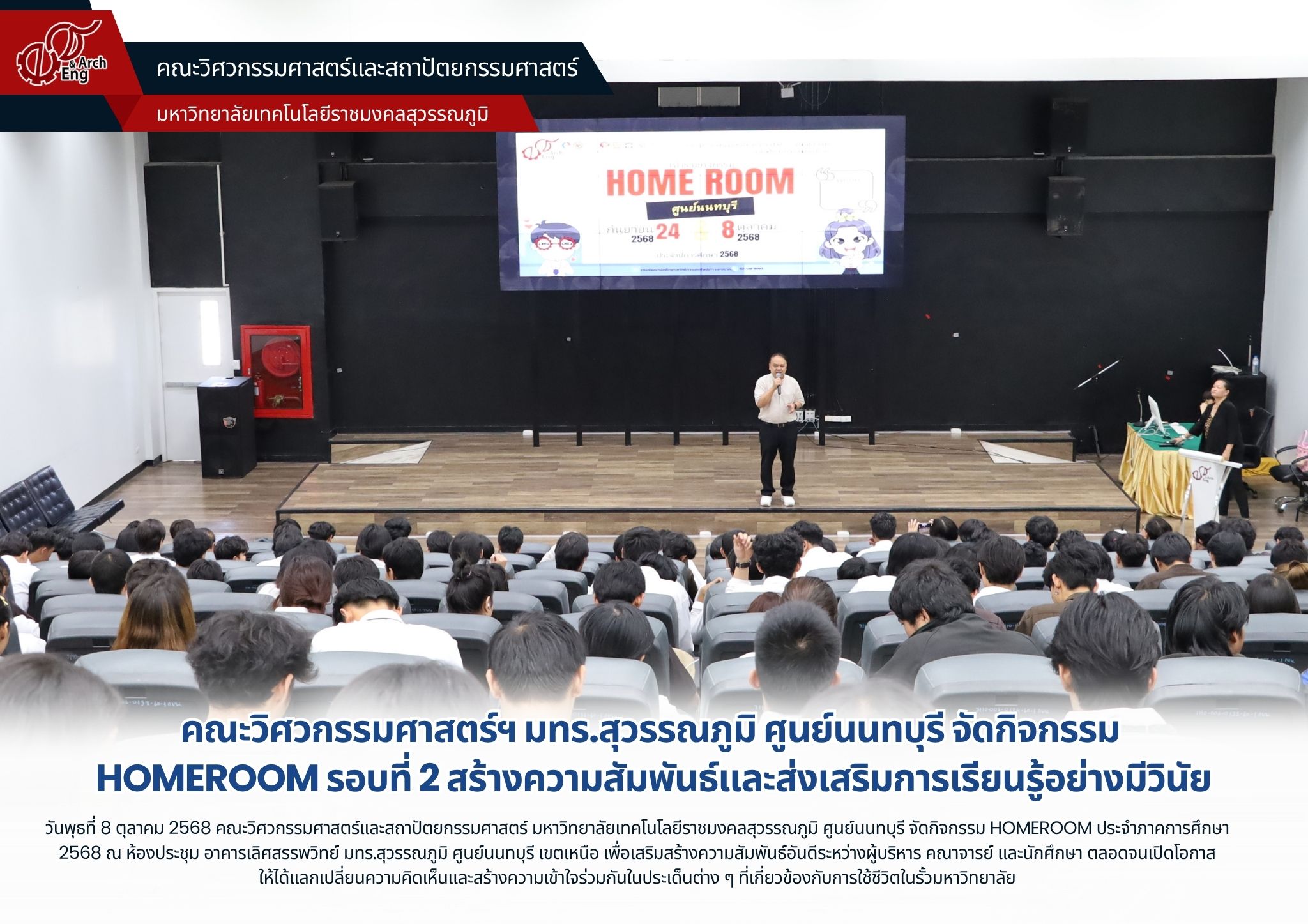 วันพุธที่ 8 ตุลาคม 2568 คณะวิศวกรรมศาสตร์และสถาปัตยกรรมศาสตร์ มหาวิทยาลัยเทคโนโลยีราชมงคลสุวรรณภูมิ ศูนย์นนทบุรี จัดกิจกรรม HOMEROOM ประจำภาคการศึกษา 2568 รอบที่ 2 ณ ห้องประชุม อาคารเลิศสรรพวิทย์ มทร.สุวรรณภูมิ ศูนย์นนทบุรี เขตเหนือ เพื่อเสริมสร้างความสัมพันธ์อันดีระหว่างผู้บริหาร คณาจารย์ และนักศึกษา ตลอดจนเปิดโอกาสให้ได้แลกเปลี่ยนความคิดเห็นและสร้างความเข้าใจร่วมกันในประเด็นต่าง ๆ ที่เกี่ยวข้องกับการใช้ชีวิตในรั้วมหาวิทยาลัย