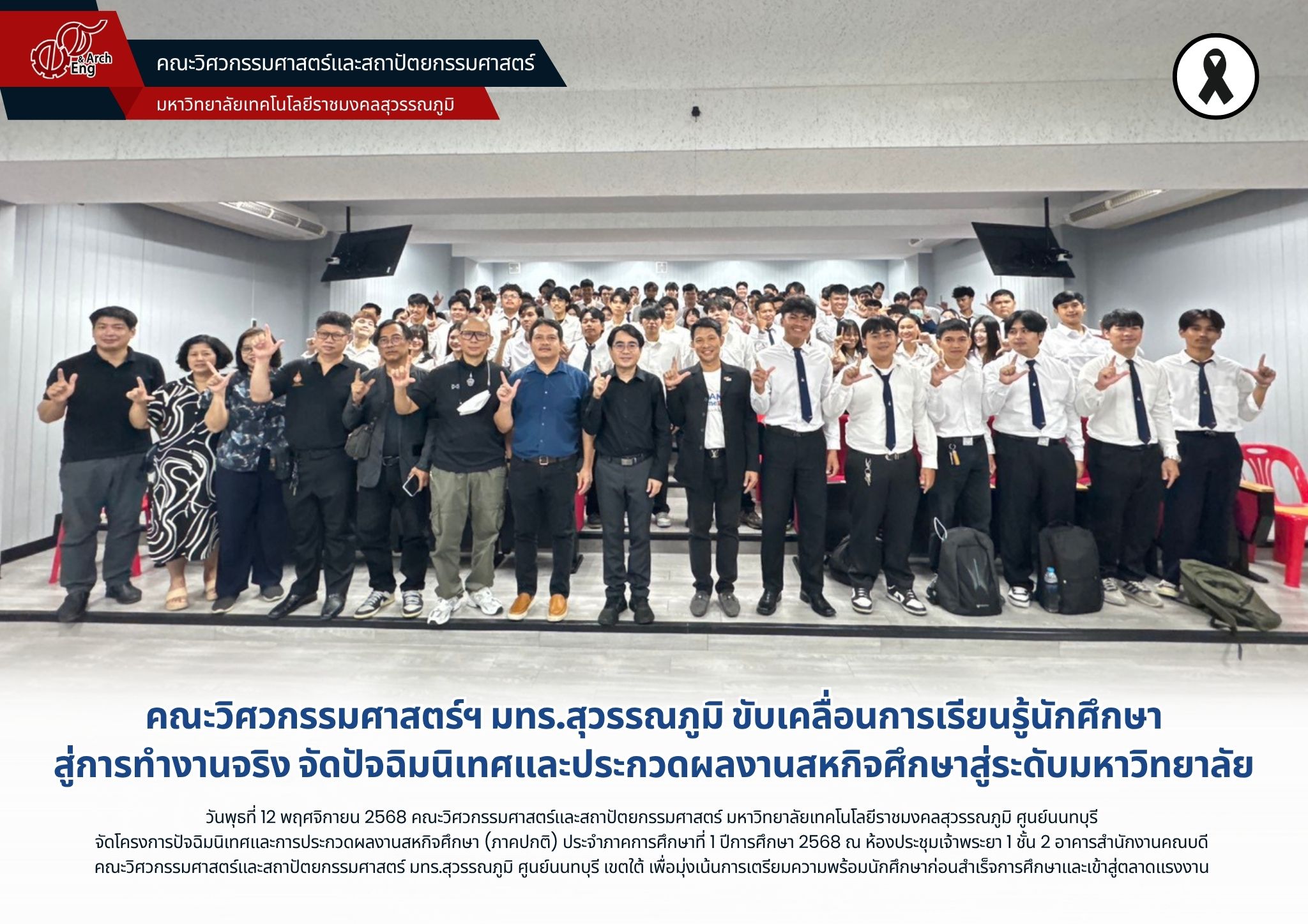 วันพุธที่ 12 พฤศจิกายน 2568 คณะวิศวกรรมศาสตร์และสถาปัตยกรรมศาสตร์ มหาวิทยาลัยเทคโนโลยีราชมงคลสุวรรณภูมิ ศูนย์นนทบุรี จัดโครงการปัจฉิมนิเทศและการประกวดผลงานสหกิจศึกษา (ภาคปกติ) ประจำภาคการศึกษาที่ 1 ปีการศึกษา 2568 ณ ห้องประชุมเจ้าพระยา 1 ชั้น 2 อาคารสำนักงานคณบดีคณะวิศวกรรมศาสตร์และสถาปัตยกรรมศาสตร์ มทร.สุวรรณภูมิ ศูนย์นนทบุรี เขตใต้ โดย ผู้ช่วยศาสตราจารย์พัชระ กัญจนกาญจน์ คณบดีคณะวิศวกรรมศาสตร์ฯ มอบหมายให้ รองศาสตราจารย์ ดร.ยุทธนา กันทะพะเยา รองคณบดีคณะวิศวกรรมศาสตร์ฯ เป็นประธานเปิดโครงการฯ พร้อมทั้งคณาจารย์ และนักศึกษาเข้าร่วมอย่างพร้อมเพรียง เพื่อเตรียมความพร้อมนักศึกษาก่อนสำเร็จการศึกษาและเข้าสู่ตลาดแรงงาน