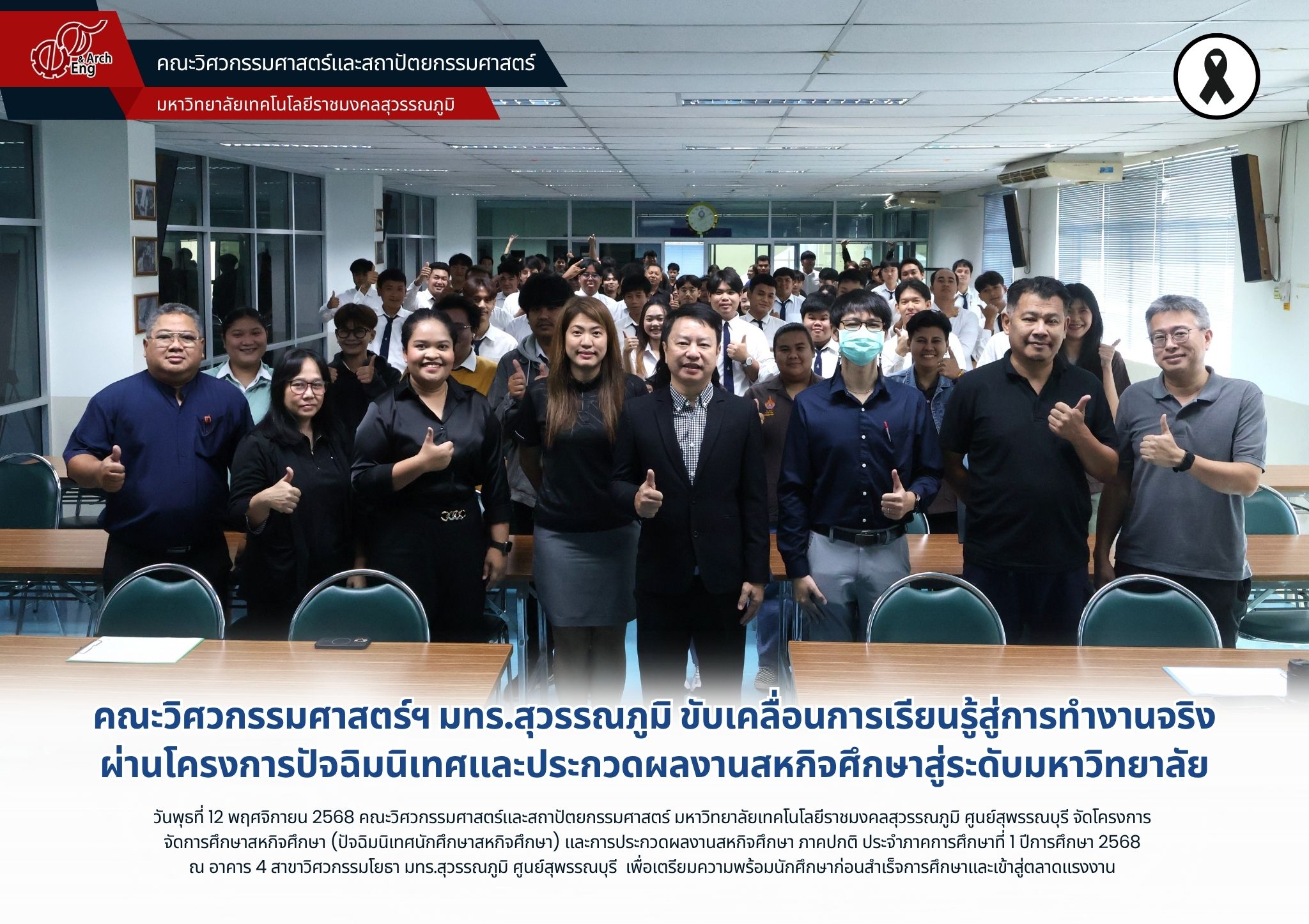 วันพุธที่ 12 พฤศจิกายน 2568 คณะวิศวกรรมศาสตร์และสถาปัตยกรรมศาสตร์ มหาวิทยาลัยเทคโนโลยีราชมงคลสุวรรณภูมิ ศูนย์สุพรรณบุรี จัดโครงการ จัดการศึกษาสหกิจศึกษา (ปัจฉิมนิเทศนักศึกษาสหกิจศึกษา) และการประกวดผลงานสหกิจศึกษา ภาคปกติ ประจำภาคการศึกษาที่ 1 ปีการศึกษา 2568 ณ อาคาร 4 สาขาวิศวกรรมโยธา มทร.สุวรรณภูมิ ศูนย์สุพรรณบุรี โดยมี รองศาสตราจารย์ ดร.ณรงค์ชัย วิวัฒนาช่าง รองคณบดีคณะวิศวกรรมศาสตร์ฯ ประจำศูนย์สุพรรณบุรี เป็นประธานเปิดโครงการ พร้อมด้วยคณาจารย์ และนักศึกษาเข้าร่วมกิจกรรมอย่างพร้อมเพรียง เพื่อให้นักศึกษาได้นำเสนอผลงานและแลกเปลี่ยนประสบการณ์จากการปฏิบัติงานสหกิจศึกษาต่อคณาจารย์นิเทศ เพื่อประเมินและคัดเลือกผลงานที่โดดเด่นสำหรับการประกวดในระดับมหาวิทยาลัยต่อไป นอกจากนี้ โครงการยังมุ่งเน้นการส่งเสริมและพัฒนาทักษะทางวิชาชีพของนักศึกษา ทั้งด้านการวิเคราะห์ การแก้ปัญหา และการประยุกต์ใช้ความรู้ในสถานการณ์จริง พร้อมเตรียมความพร้อมนักศึกษาเข้าสู่ตลาดแรงงาน