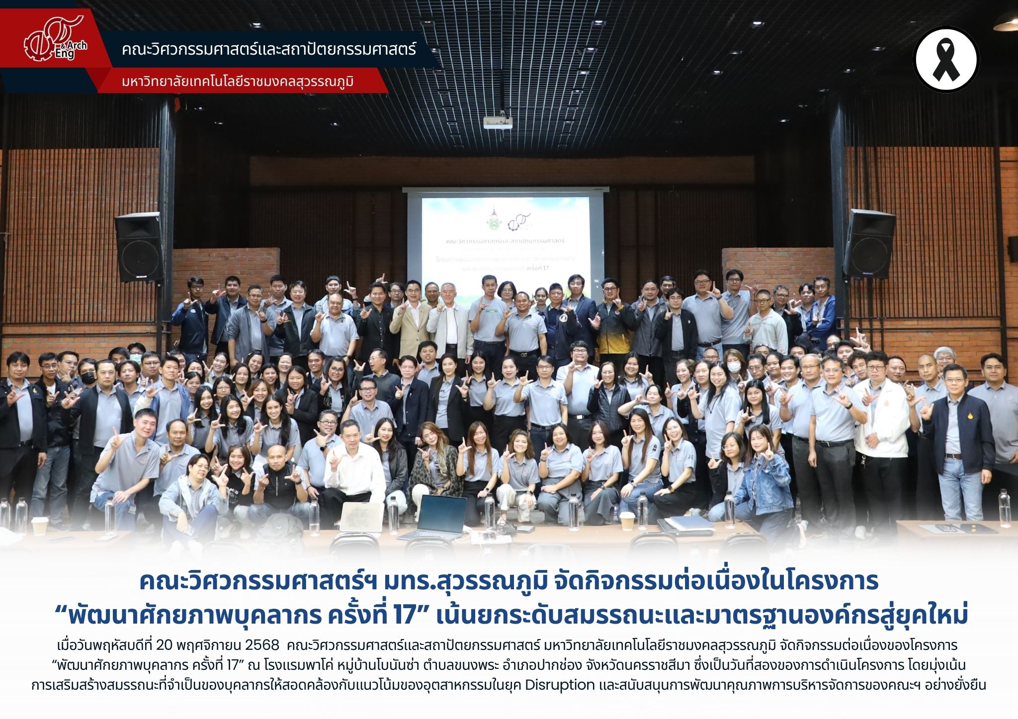 คณะวิศวกรรมศาสตร์ฯ มทร.สุวรรณภูมิ จัดกิจกรรมต่อเนื่องในโครงการ “พัฒนาศักยภาพบุคลากร ครั้งที่ 17” เน้นยกระดับสมรรถนะและมาตรฐานองค์กรสู่ยุคใหม่