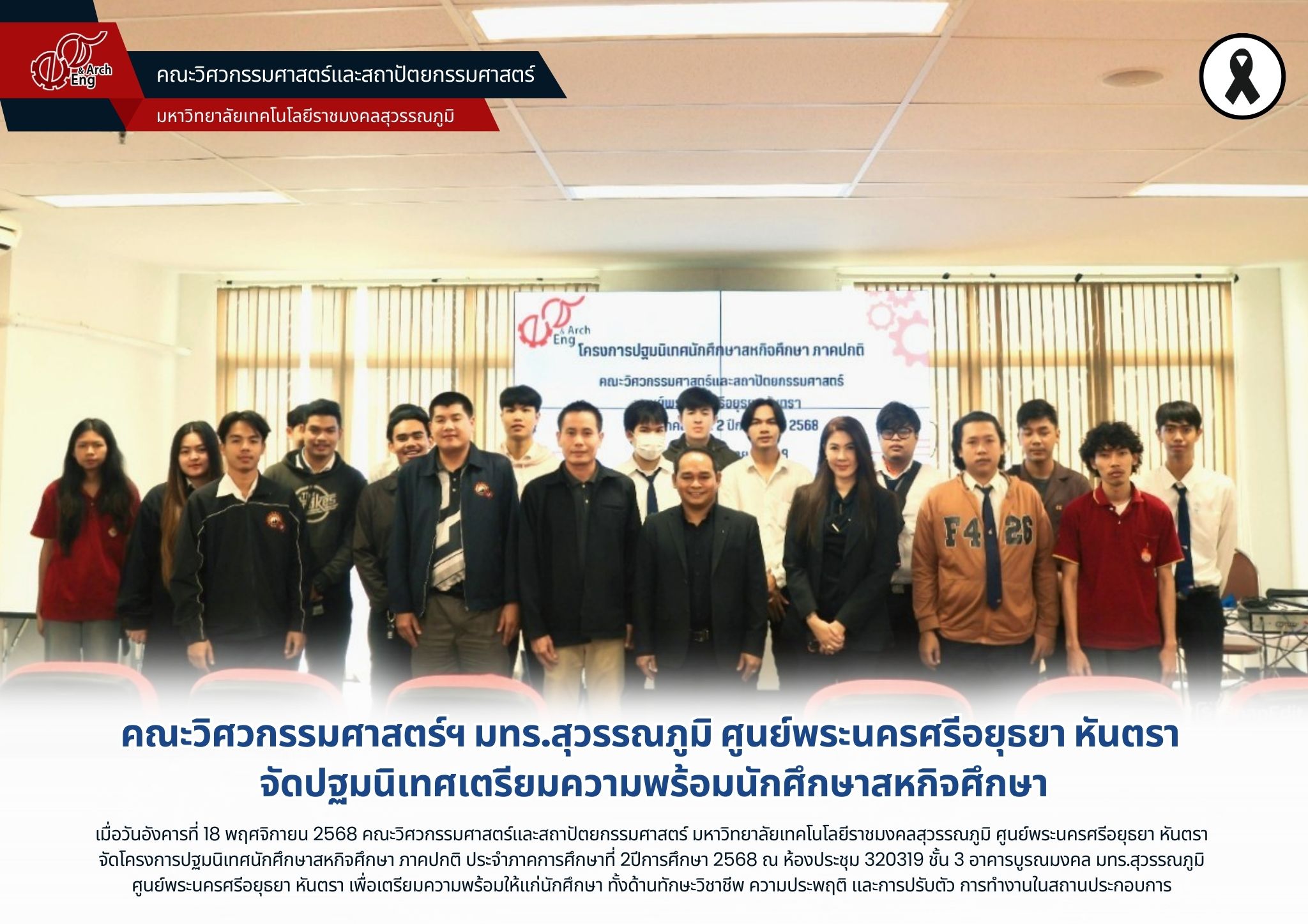 เมื่อวันอังคารที่ 18 พฤศจิกายน 2568 คณะวิศวกรรมศาสตร์และสถาปัตยกรรมศาสตร์ มหาวิทยาลัยเทคโนโลยีราชมงคลสุวรรณภูมิ ศูนย์พระนครศรีอยุธยา หันตรา จัดโครงการปฐมนิเทศนักศึกษาสหกิจศึกษา ภาคปกติ ประจำภาคการศึกษาที่ 2 ปีการศึกษา 2568 ณ ห้องประชุม 320319 ชั้น 3 อาคารบูรณมงคล มทร.สุวรรณภูมิ ศูนย์พระนครศรีอยุธยา หันตรา โดยมี ผู้ช่วยศาสตราจารย์พัชระ กัญจนกาญจน์ คณบดีคณะวิศวกรรมศาสตร์ฯ เป็นประธานเปิดโครงการ พร้อมกล่าวให้โอวาทและข้อคิดแก่นักศึกษาก่อนออกฝึกสหกิจศึกษา และเตรียมความพร้อมให้แก่นักศึกษา ทั้งด้านทักษะวิชาชีพ ความประพฤติ และการปรับตัว การทำงานในสถานประกอบการ โดยมุ่งเน้นให้นักศึกษาเข้าใจถึงบทบาท หน้าที่ และมาตรฐานการปฏิบัติงานอย่างมืออาชีพ นอกจากนี้ ผู้ช่วยศาสตราจารย์ชัยยันต์ ใจบุญมา ผู้ช่วยคณบดี ได้บรรยายพิเศษในหัวข้อ “การปฏิบัติตนในสถานประกอบการ” พร้อมแนะนำคู่มือและแบบฟอร์มโครงการสหกิจศึกษา รวมถึงแนวทางการจัดทำและนำเสนอโปสเตอร์ เพื่อให้นักศึกษาได้มีความรู้และความเข้าใจขั้นตอนการปฏิบัติงานอย่างถูกต้องและมีประสิทธิภาพ