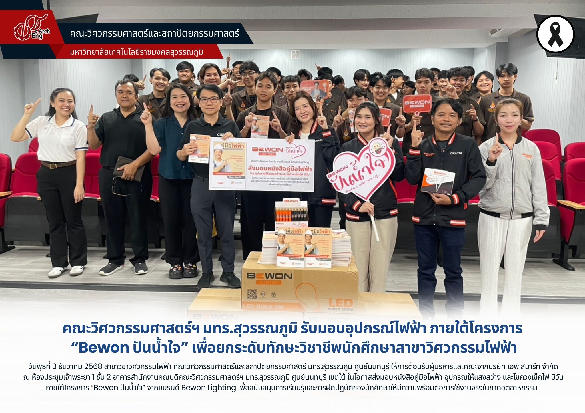 วันพุธที่ 3 ธันวาคม 2568 สาขาวิชาวิศวกรรมไฟฟ้า คณะวิศวกรรมศาสตร์และสถาปัตยกรรมศาสตร์ มหาวิทยาลัยเทคโนโลยีราชมงคลสุวรรณภูมิ ศูนย์นนทบุรี ให้การต้อนรับผู้บริหารและคณะจากบริษัท เอพี สมาร์ท จำกัด ณ ห้องประชุมเจ้าพระยา 1 ชั้น 2 อาคารสำนักงานคณบดีคณะวิศวกรรมศาสตร์และสถาปัตยกรรมศาสตร์ มทร.สุวรรณภูมิ ศูนย์นนทบุรี เขตใต้ ในโอกาสส่งมอบหนังสือคู่มือไฟฟ้า อุปกรณ์ให้แสงสว่าง และไขควงเช็คไฟ บีวัน ภายใต้โครงการ “Bewon ปันน้ำใจ” จากแบรนด์ Bewon Lighting เพื่อสนับสนุนการเรียนรู้และการฝึกปฏิบัติของนักศึกษาให้มีความพร้อมต่อการใช้งานจริงในภาคอุตสาหกรรม โดยมี ผู้ช่วยศาสตราจารย์ ดร.สรายุธ ทองกุลภัทร์ หัวหน้าสาขาวิชาวิศวกรรมไฟฟ้า เป็นประธานกล่าวต้อนรับและขอบคุณบริษัท เอพี สมาร์ท จำกัด ที่ให้ความสำคัญกับการส่งเสริมทักษะด้านวิศวกรรมไฟฟ้าให้แก่นักศึกษา และร่วมสนับสนุนสื่อการเรียนรู้ รวมถึงอุปกรณ์ที่มีมาตรฐาน ซึ่งจะช่วยเพิ่มพูนทักษะด้านวิชาชีพและยกระดับความพร้อมก่อนออกสู่ตลาดแรงงาน ด้านบริษัท เอพี สมาร์ท จำกัด นำโดยคุณวรินพัทร์ เครือรัตนกิจ ผู้จัดการฝ่ายการตลาด พร้อมด้วยคณะ ให้เกียรติเป็นผู้แทนในการส่งมอบชุดอุปกรณ์ในครั้งนี้