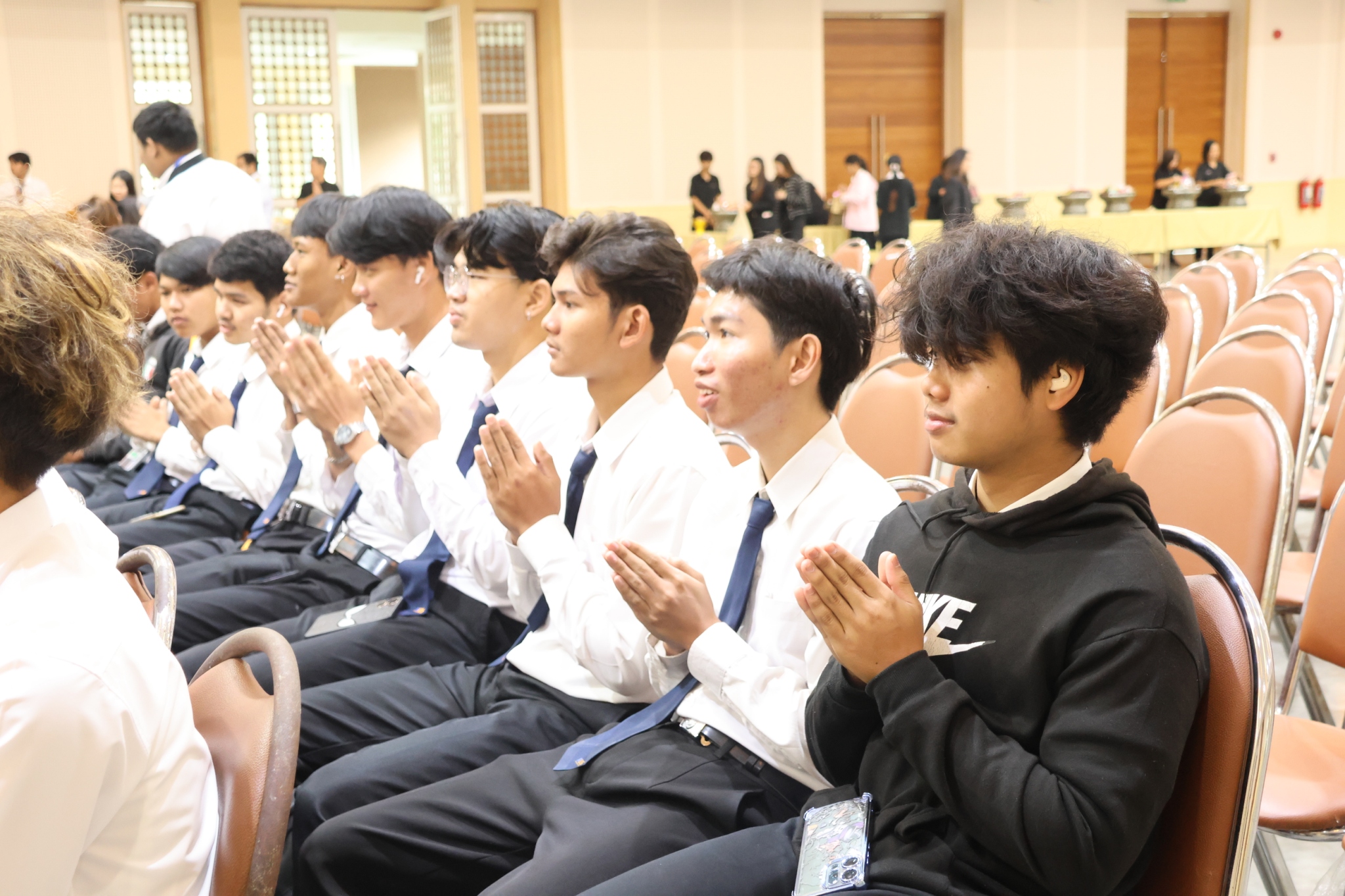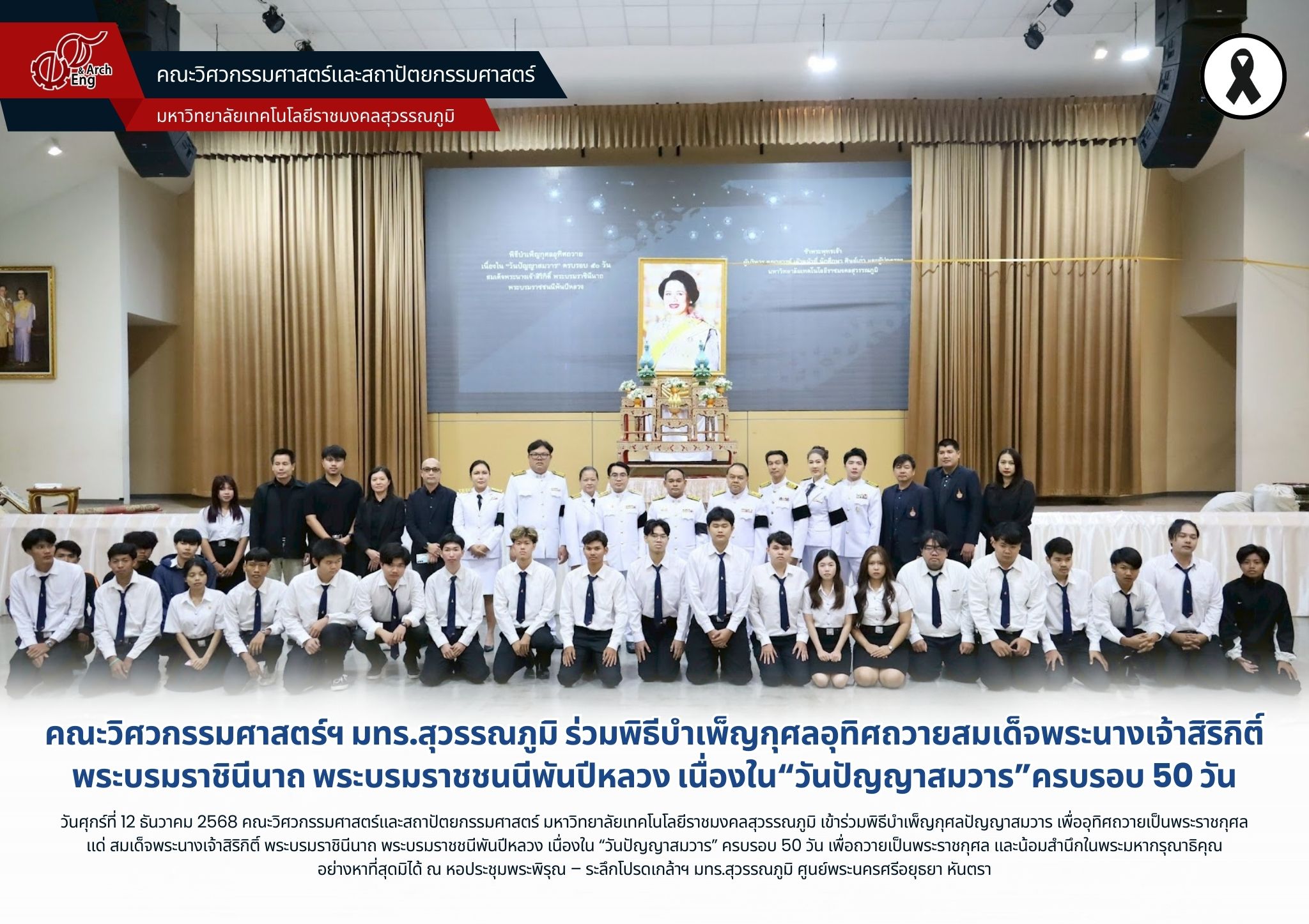 วันศุกร์ที่ 12 ธันวาคม 2568 คณะวิศวกรรมศาสตร์และสถาปัตยกรรมศาสตร์ มหาวิทยาลัยเทคโนโลยีราชมงคลสุวรรณภูมิ นำโดย ผู้ช่วยศาสตราจารย์พัชระ กัญจนกาญจน์ คณบดีคณะวิศวกรรมศาสตร์ฯ พร้อมด้วยรองคณบดี คณาจารย์ เจ้าหน้าที่ และนักศึกษา เข้าร่วมพิธีบำเพ็ญกุศลปัญญาสมวาร เพื่ออุทิศถวายเป็นพระราชกุศลแด่ สมเด็จพระนางเจ้าสิริกิติ์ พระบรมราชินีนาถ พระบรมราชชนีพันปีหลวง เนื่องใน “วันปัญญาสมวาร” ครบรอบ 50 วัน เพื่อถวายเป็นพระราชกุศล และน้อมสำนึกในพระมหากรุณาธิคุณอย่างหาที่สุดมิได้ ณ หอประชุมพระพิรุณ – ระลึกโปรดเกล้าฯ มทร.สุวรรณภูมิ ศูนย์พระนครศรีอยุธยา หันตรา