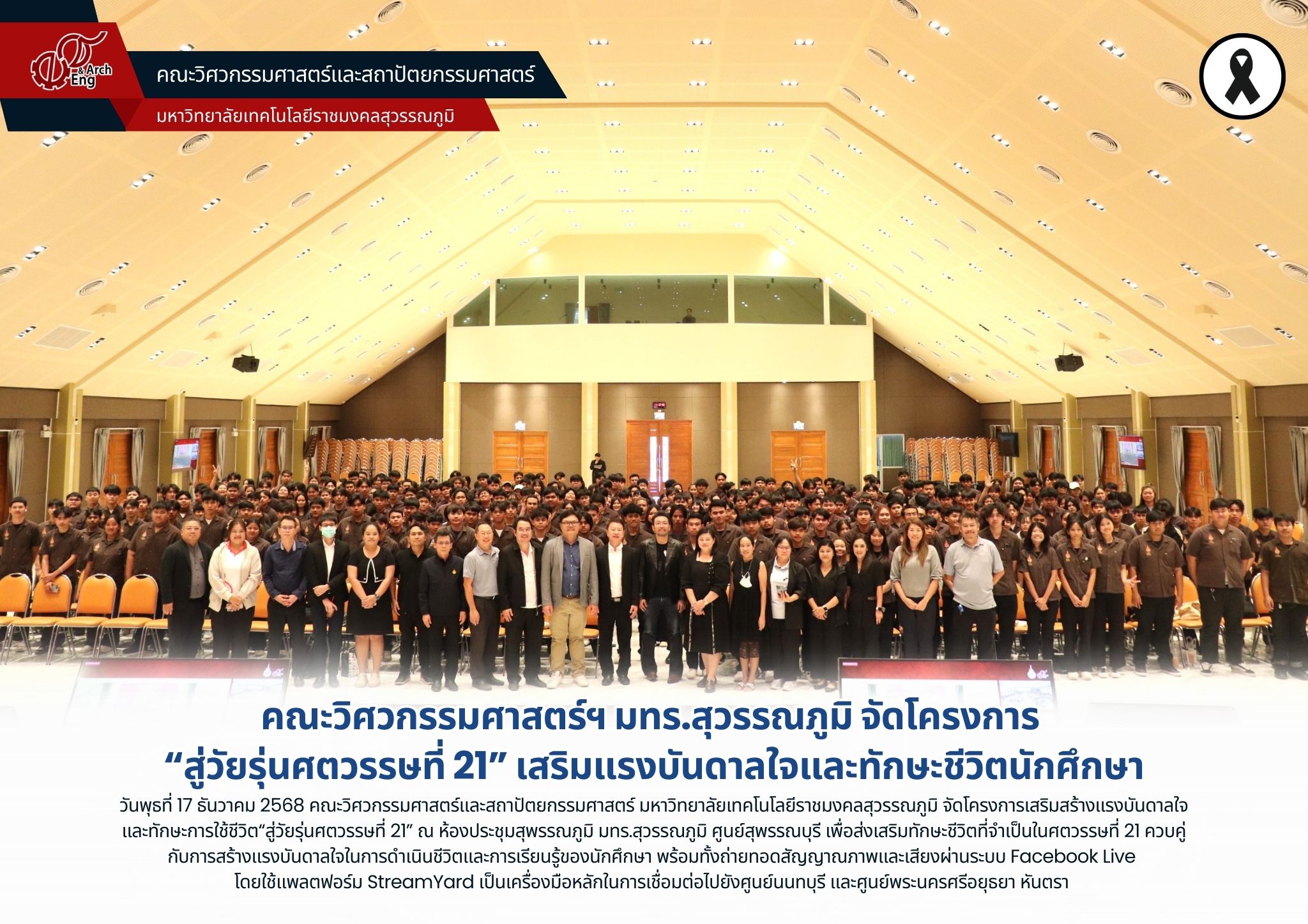 วันพุธที่ 17 ธันวาคม 2568 คณะวิศวกรรมศาสตร์และสถาปัตยกรรมศาสตร์ มหาวิทยาลัยเทคโนโลยีราชมงคลสุวรรณภูมิ จัดโครงการเสริมสร้างแรงบันดาลใจและทักษะการใช้ชีวิต “สู่วัยรุ่นศตวรรษที่ 21” ณ ห้องประชุมสุพรรณภูมิ มทร.สุวรรณภูมิ ศูนย์สุพรรณบุรี เพื่อส่งเสริมทักษะชีวิตที่จำเป็นในศตวรรษที่ 21 ควบคู่กับการสร้างแรงบันดาลใจในการดำเนินชีวิตและการเรียนรู้ของนักศึกษา พร้อมทั้งถ่ายทอดสัญญาณภาพและเสียงผ่านระบบ Facebook Live โดยใช้แพลตฟอร์ม StreamYard เป็นเครื่องมือหลักในการเชื่อมต่อไปยังศูนย์นนทบุรี และศูนย์พระนครศรีอยุธยา หันตรา เปิดโอกาสให้นักศึกษาและผู้สนใจจากทุกศูนย์สามารถเข้าร่วมกิจกรรมได้อย่างทั่วถึง ลดข้อจำกัดด้านสถานที่ และสอดคล้องกับการจัดกิจกรรมในยุคดิจิทัล โดย ผู้ช่วยศาสตราจารย์พัชระ กัญจนกาญจน์ คณบดีคณะวิศวกรรมศาสตร์ฯ ได้มอบหมายให้ ดร.กฤษณะ จิรสารสวัสดิ์ รองคณบดี เป็นประธานกล่าวเปิดโครงการ พร้อมทั้งได้รับเกียรติจากศิลปินชื่อดัง คุณเกตุเสพย์สวัสดิ์ ปาลกะวงศ์ ณ อยุธยา “น้าเน็ก” มาร่วมถ่ายทอดประสบการณ์และแนวคิดสร้างแรงบันดาลใจให้แก่นักศึกษา โดยเน้นประเด็นการปรับตัวให้เท่าทันการเปลี่ยนแปลงในยุคปัจจุบัน การตัดสินใจในสถานการณ์ที่ท้าทาย รวมถึงการจัดการอารมณ์และความเครียดอย่างเหมาะสม