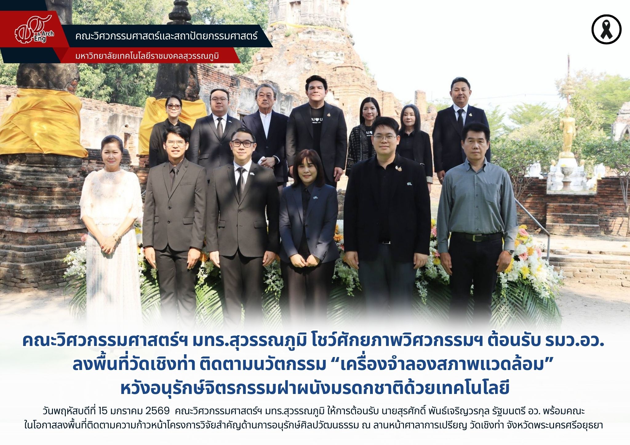 วันพฤหัสบดีที่ 15 มกราคม 2569 คณะวิศวกรรมศาสตร์และสถาปัตยกรรมศาสตร์ มหาวิทยาลัยเทคโนโลยีราชมงคลสุวรรณภูมิ ให้การต้อนรับ นายสุรศักดิ์ พันธ์เจริญวรกุล รัฐมนตรีว่าการกระทรวงการอุดมศึกษา วิทยาศาสตร์ วิจัยและนวัตกรรม (อว.) และประธานหน่วยบริหารและจัดการทุนด้านพัฒนากำลังคน การวิจัยและนวัตกรรม (บพค.) พร้อมคณะ ในโอกาสลงพื้นที่ติดตามความก้าวหน้าโครงการวิจัยสำคัญด้านการอนุรักษ์ศิลปวัฒนธรรม ณ ลานหน้าศาลาการเปรียญ วัดเชิงท่า จังหวัดพระนครศรีอยุธยา มุ่งเน้นการใช้นวัตกรรมวิศวกรรมเครื่องกลเพื่อปกป้องจิตรกรรมฝาผนังจากการเสื่อมสภาพ