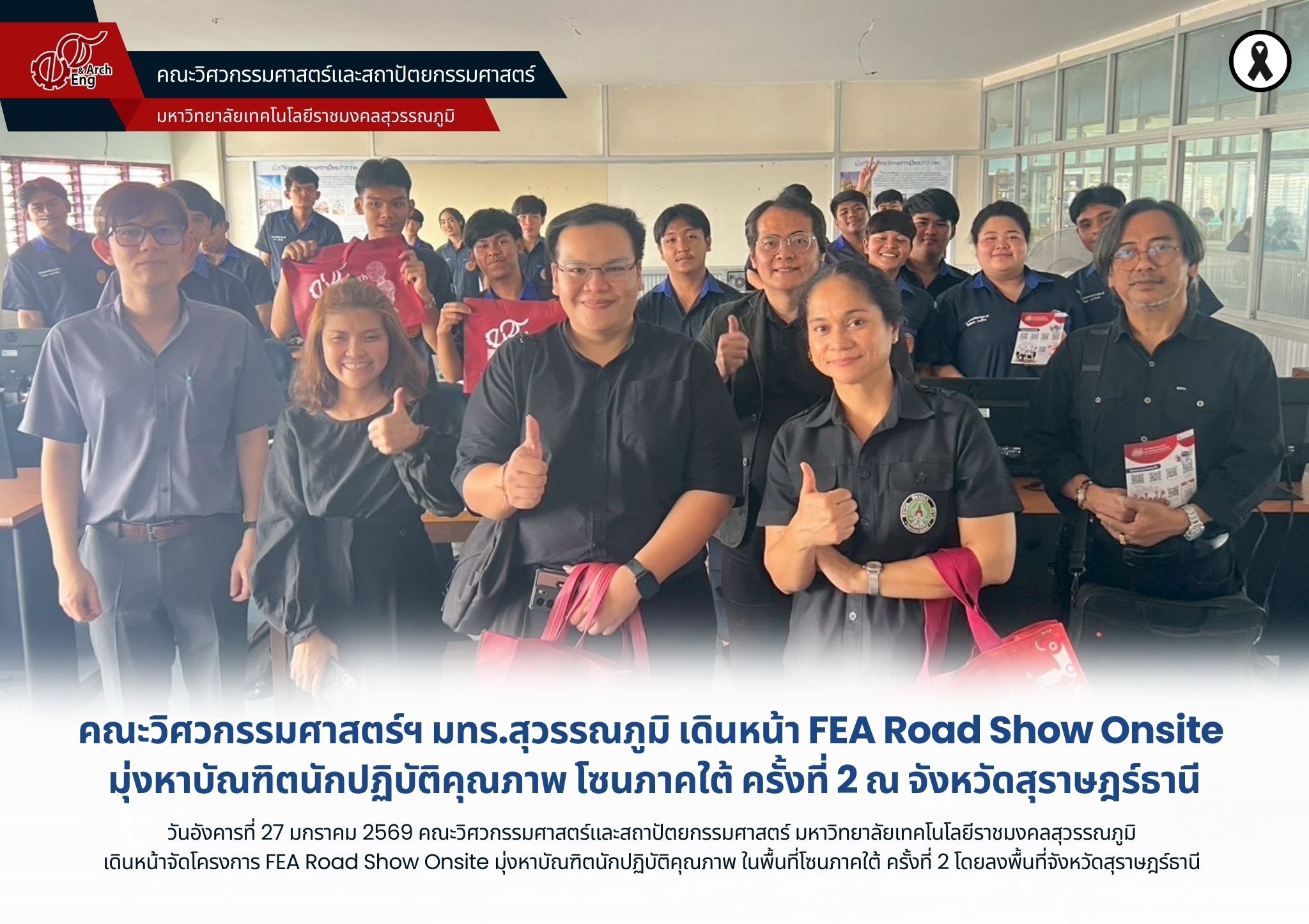 คณะวิศวกรรมศาสตร์ฯ มทร.สุวรรณภูมิ เดินหน้า FEA Road Show Onsite มุ่งหาบัณฑิตนักปฏิบัติคุณภาพ โซนภาคใต้ ครั้งที่ 2 ณ จังหวัดสุราษฎร์ธานี