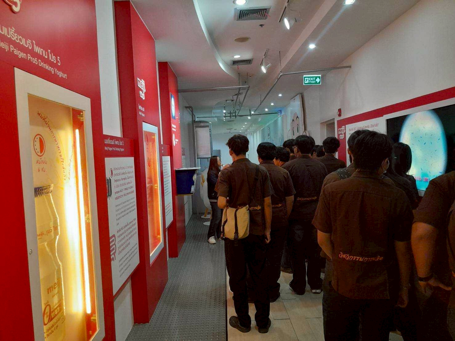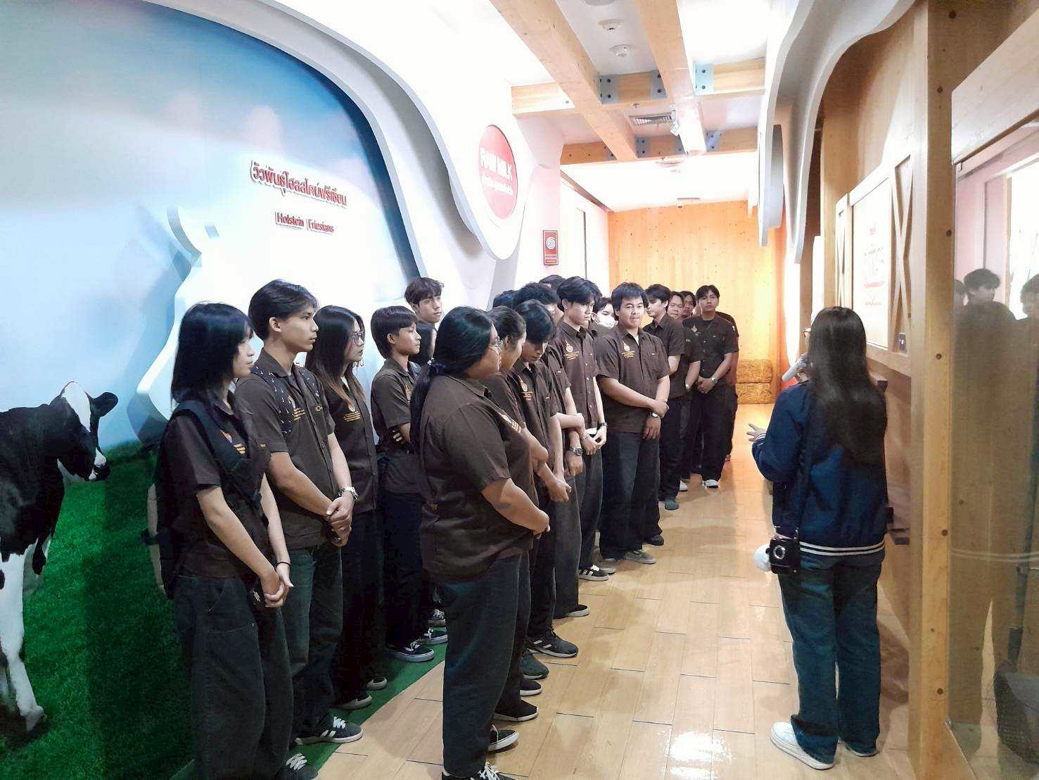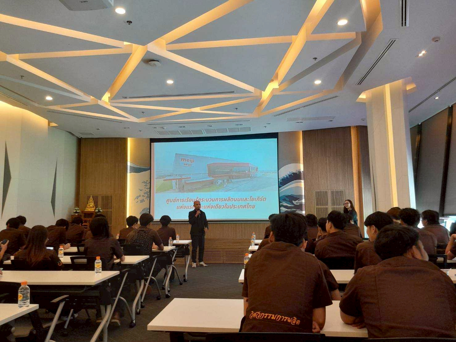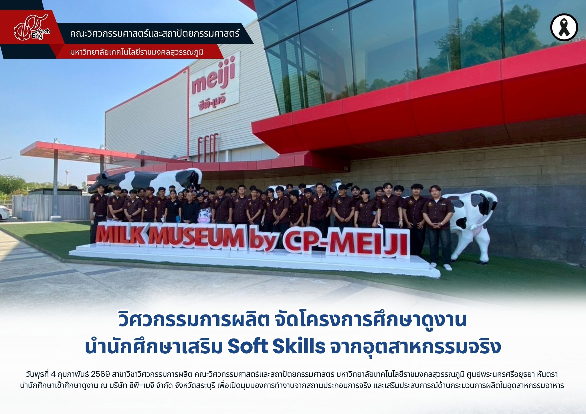 เมื่อวันพุธที่ 4 กุมภาพันธ์ 2569 สาขาวิชาวิศวกรรมการผลิต คณะวิศวกรรมศาสตร์และสถาปัตยกรรมศาสตร์ มหาวิทยาลัยเทคโนโลยีราชมงคลสุวรรณภูมิ ศูนย์พระนครศรีอยุธยา หันตรา นำนักศึกษาเข้าศึกษาดูงาน ณ บริษัท ซีพี-เมจิ จำกัด จังหวัดสระบุรี เพื่อเปิดมุมมองการทำงานจากสถานประกอบการจริง และเสริมประสบการณ์ด้านกระบวนการผลิตในอุตสาหกรรมอาหาร นอกจากนี้เพื่อให้นักศึกษาได้เห็นภาพจริงของการผลิตตั้งแต่วัตถุดิบไปจนถึงผลิตภัณฑ์สำเร็จรูป รวมถึงการบริหารจัดการภายในโรงงาน การควบคุมคุณภาพ และการดำเนินงานตามมาตรฐานการผลิตที่อุตสาหกรรมให้ความสำคัญ โดยได้รับเกียรติจากคุณครองขวัญ ประภัษรากุล หัวหน้าเจ้าหน้าที่พิพิธภัณฑ์ Milk Museum เป็นวิทยากรบรรยายให้ความรู้เกี่ยวกับกระบวนการผลิตผลิตภัณฑ์นม แนวคิดด้านคุณภาพและมาตรฐาน ตลอดจนตัวอย่างการจัดการงานในภาคอุตสาหกรรม