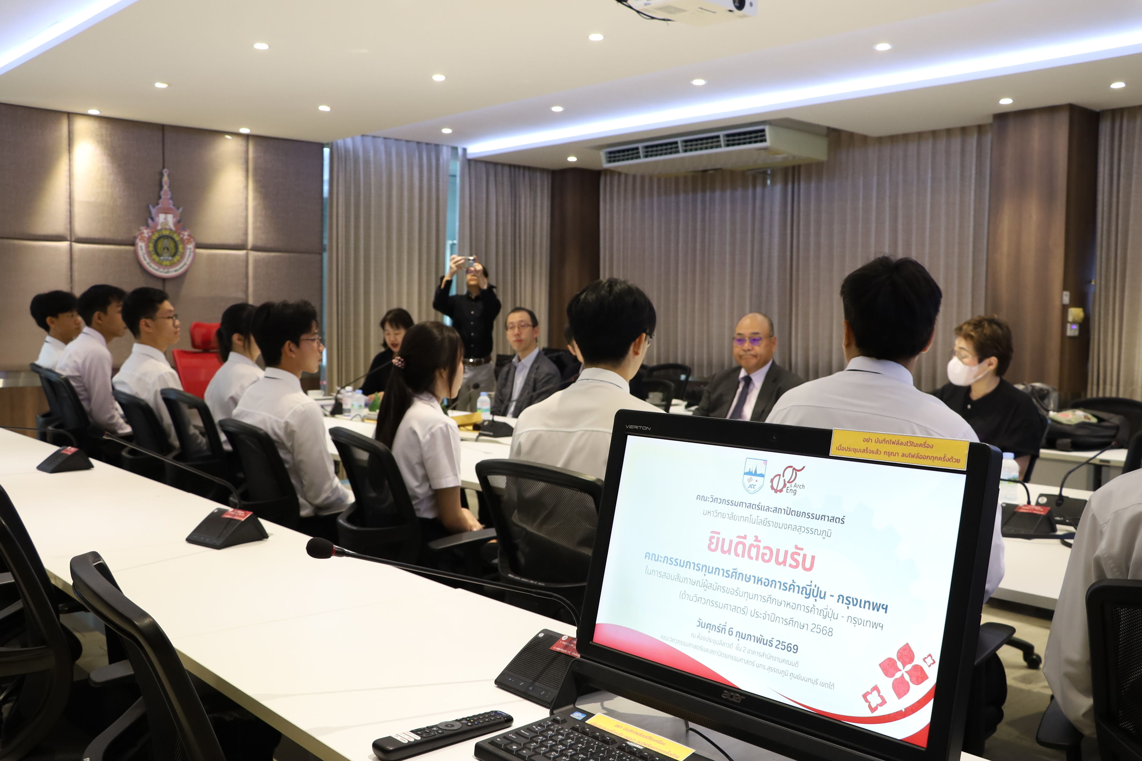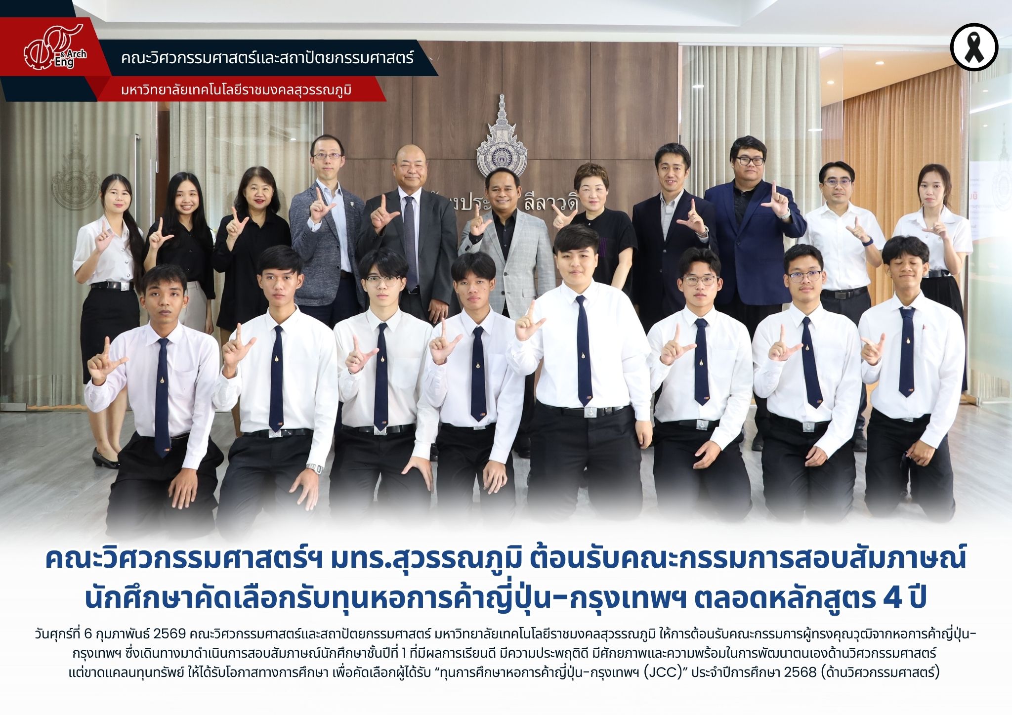 เมื่อวันศุกร์ที่ 6 กุมภาพันธ์ 2569 คณะวิศวกรรมศาสตร์และสถาปัตยกรรมศาสตร์ มหาวิทยาลัยเทคโนโลยีราชมงคลสุวรรณภูมิ นำโดย ผู้ช่วยศาสตราจารย์พัชระ กัญจนกาญจน์ คณบดีคณะวิศวกรรมศาสตร์ฯ พร้อมด้วยผู้บริหาร คณาจารย์ และนักศึกษา ให้การต้อนรับคณะกรรมการผู้ทรงคุณวุฒิจากหอการค้าญี่ปุ่น-กรุงเทพฯ (Japanese Chamber of Commerce, Bangkok: JCC) ซึ่งเดินทางมาดำเนินการสอบสัมภาษณ์นักศึกษาชั้นปีที่ 1 ที่มีผลการเรียนดี มีความประพฤติดีมีศักยภาพและความพร้อมในการพัฒนาตนเองด้านวิศวกรรมศาสตร์ แต่ขาดแคลนทุนทรัพย์ ให้ได้รับโอกาสทางการศึกษา เพื่อคัดเลือกผู้ได้รับ “ทุนการศึกษาหอการค้าญี่ปุ่น-กรุงเทพฯ (JCC)” ประจำปีการศึกษา 2568 (ด้านวิศวกรรมศาสตร์) ณ ห้องประชุมลีลาวดี ชั้น 2 อาคารสำนักงานคณบดีคณวิศวกรรมศาสตร์ฯ มทร.สุวรรณภูมิ ศูนย์นนทบุรี เขตใต้ ทั้งนี้ คณะกรรมการสัมภาษณ์ได้รับเกียรติจากผู้บริหารจากหอการค้าญี่ปุ่น-กรุงเทพฯ และภาคอุตสาหกรรม ได้แก่ Mr. Kazushige Asada, President, Teijin Polyester (Thailand) Co., Ltd., Mr. Yuji Konishi, AGC Group Network Manager, AGC Flat Glass (Thailand) Plc., Ms. Pornumpai Viravan, General Manager of Human Resources Division, Mitsui & Co., (Thailand) Ltd. และ Mr. Yu Takehisa, Secretary General, JCC