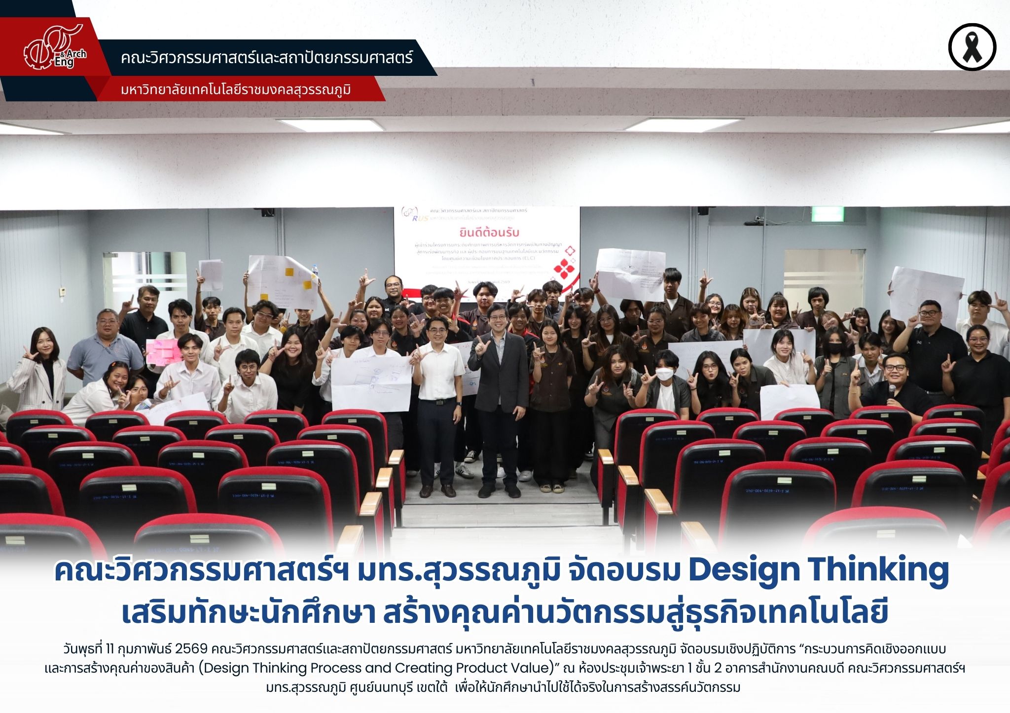 เมื่อวันพุธที่ 11 กุมภาพันธ์ 2569 คณะวิศวกรรมศาสตร์และสถาปัตยกรรมศาสตร์ มหาวิทยาลัยเทคโนโลยีราชมงคลสุวรรณภูมิ จัดอบรมเชิงปฏิบัติการ “กระบวนการคิดเชิงออกแบบและการสร้างคุณค่าของสินค้า (Design Thinking Process and Creating Product Value)” ภายใต้โครงการยกระดับศักยภาพการบริหารจัดการทรัพย์สินทางปัญญาสู่การเร่งพัฒนาธุรกิจและผู้ประกอบการบนฐานเทคโนโลยีและนวัตกรรม โดยศูนย์ความเชื่อมโยงภาคประกอบการ (ELC) ซึ่งเป็นส่วนหนึ่งของกิจกรรมที่ 2 “ยกระดับศักยภาพผลงานนวัตกรรมเพื่อขับเคลื่อนธุรกิจเทคโนโลยี” และกิจกรรมคลินิกให้คำปรึกษาและแลกเปลี่ยนเรียนรู้ด้านการเร่งพัฒนาธุรกิจและผู้ประกอบการ ณ ห้องประชุมเจ้าพระยา 1 ชั้น 2 อาคารสำนักงานคณบดีคณะวิศวกรรมศาสตร์ฯ มทร.สุวรรณภูมิ ศูนย์นนทบุรี เขตใต้ โดยผู้ช่วยศาสตราจารย์พัชระ กัญจนกาญจน์ คณบดีคณะวิศวกรรมศาสตร์ฯ มอบหมายให้ รองศาสตราจารย์ ดร.ยุทธนา กันทะพะเยา เป็นประธานเปิดโครงการฯ ภายในกิจกรรมได้รับเกียรติจาก ดร.โพธิวัฒน์ งามขจรวิวัฒน์ ผู้เชี่ยวชาญด้านการพัฒนาธุรกิจและนวัตกรรม เป็นวิทยากรบรรยายและนำกิจกรรม Workshop ถ่ายทอดแนวคิด Design Thinking ตั้งแต่การมองปัญหาให้ตรงจุด ทำความเข้าใจผู้ใช้งาน ไปจนถึงการต่อยอดเป็นแนวทางพัฒนาผลิตภัณฑ์และวางแผนธุรกิจบนฐานเทคโนโลยี เพื่อให้นักศึกษานำไปใช้ได้จริงในการสร้างสรรค์นวัตกรรม ทั้งนี้ มีนักศึกษาคณะวิศวกรรมศาสตร์และสถาปัตยกรรมศาสตร์ เข้าร่วมจำนวน 50 คน จากทั้ง 3 ศูนย์พื้นที่ร่วมแลกเปลี่ยนเรียนรู้และพัฒนาทักษะสำคัญที่จำเป็นต่อการก้าวสู่การเป็นผู้ประกอบการรุ่นใหม่ในอนาคต