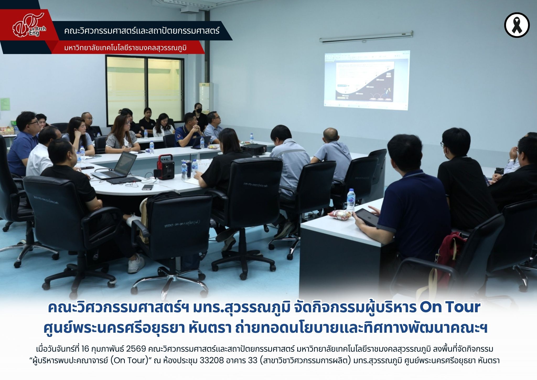 เมื่อวันจันทร์ที่ 16 กุมภาพันธ์ 2569 คณะวิศวกรรมศาสตร์และสถาปัตยกรรมศาสตร์ มหาวิทยาลัยเทคโนโลยีราชมงคลสุวรรณภูมิ นำโดย ผู้ช่วยศาสตราจารย์พัชระ กัญจนกาญจน์ คณบดีคณะวิศวกรรมศาสตร์ฯ พร้อมด้วยคณะผู้บริหาร ลงพื้นที่จัดกิจกรรม “ผู้บริหารพบปะคณาจารย์ (On Tour)” ณ ห้องประชุม 33208 อาคาร 33 (สาขาวิชาวิศวกรรมการผลิต)มทร.สุวรรณภูมิ ศูนย์พระนครศรีอยุธยา หันตรา เพื่อพบปะผู้บริหารประจำศูนย์ คณาจารย์ และเจ้าหน้าที่ในพื้นที่ พร้อมทั้งมอบนโยบายด้านการบริหารจัดการและการกำกับดูแลศูนย์พื้นที่ ให้สอดคล้องกับแผนยุทธศาสตร์และทิศทางการพัฒนาของคณะฯ โดยมุ่งเน้นการสร้างความเข้าใจที่ชัดเจนในการปฏิบัติงาน และการประสานงานระหว่างส่วนกลางกับศูนย์พื้นที่ นอกจากนี้ ยังเปิดโอกาสให้ผู้เข้าร่วมได้แลกเปลี่ยนความคิดเห็นและข้อเสนอแนะในการพัฒนาการจัดการศึกษา การบริหารงานบุคคล และการดูแลนักศึกษา เพื่อให้การดำเนินงานของศูนย์พระนครศรีอยุธยา หันตรา เป็นไปในทิศทางเดียวกันกับคณะฯ และสามารถขับเคลื่อนภารกิจได้อย่างมีประสิทธิภาพ ภายใต้แนวคิด “ร่วมคิด ร่วมทำ ร่วมพัฒนา”