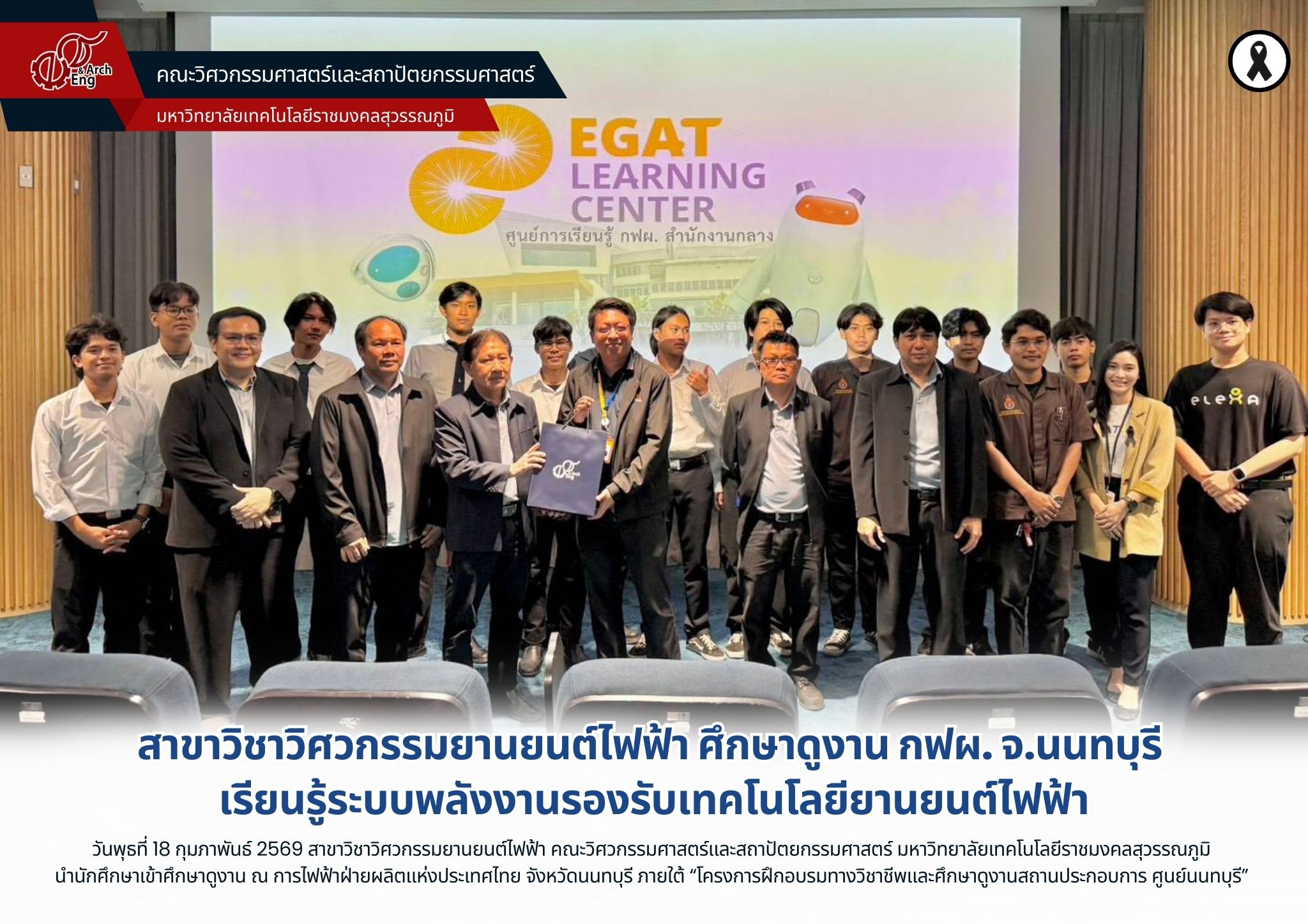 เมื่อวันพุธที่ 18 กุมภาพันธ์ 2569 สาขาวิชาวิศวกรรมยานยนต์ไฟฟ้า คณะวิศวกรรมศาสตร์และสถาปัตยกรรมศาสตร์ มหาวิทยาลัยเทคโนโลยีราชมงคลสุวรรณภูมิ นำนักศึกษาเข้าศึกษาดูงาน ณ การไฟฟ้าฝ่ายผลิตแห่งประเทศไทย จังหวัดนนทบุรี ภายใต้ “โครงการฝึกอบรมทางวิชาชีพและศึกษาดูงานสถานประกอบการ ศูนย์นนทบุรี” เพื่อเปิดมุมมองด้านพลังงานและการพัฒนายานยนต์ไฟฟ้าในระดับอุตสาหกรรม พร้อมทั้งเข้ารับฟังการบรรยายหัวข้อ “พลังงานและยานยนต์ไฟฟ้า” โดย คุณติรเทพ พิทักษานุรัตน์ วิทยากรระดับ 8 ฝ่ายจัดการธุรกิจนวัตกรรมพลังงาน พร้อมคณะ ร่วมถ่ายทอดแนวคิดเกี่ยวกับทิศทางพลังงานไฟฟ้า โครงสร้างพื้นฐานที่รองรับยานยนต์ไฟฟ้า รวมถึงบทบาทขององค์กรด้านพลังงานในการสนับสนุนการเปลี่ยนผ่านสู่ระบบขนส่งไฟฟ้า นอกจากนี้ ยังได้เข้าเยี่ยมชม ศูนย์การเรียนรู้ กฟผ. สำนักงานกลาง เพื่อศึกษาภาพรวมการผลิตและบริหารจัดการพลังงานไฟฟ้าของประเทศ