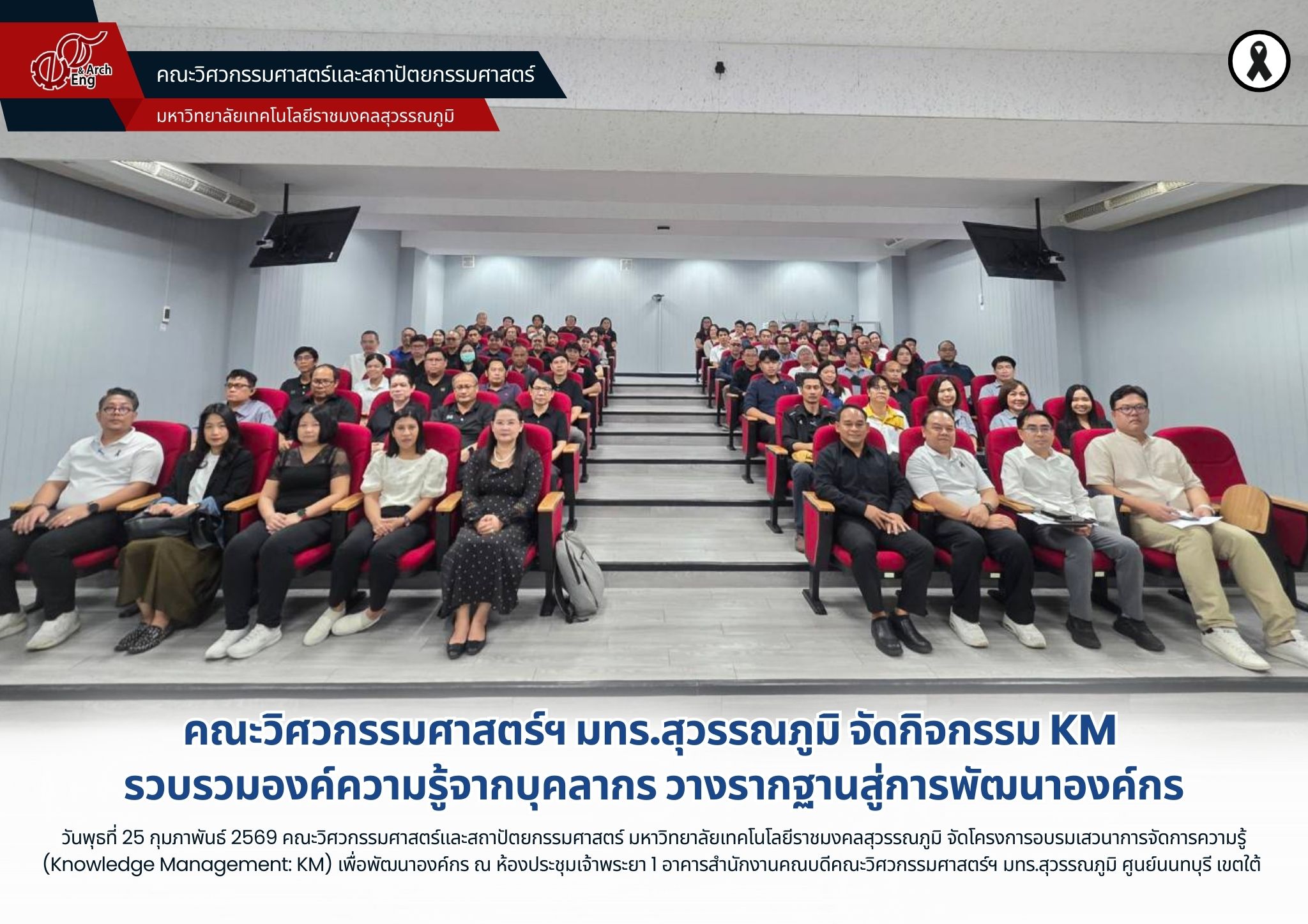 เมื่อวันพุธที่ 25 กุมภาพันธ์ 2569 คณะวิศวกรรมศาสตร์และสถาปัตยกรรมศาสตร์ มหาวิทยาลัยเทคโนโลยีราชมงคลสุวรรณภูมิ จัดโครงการอบรมเสวนาการจัดการความรู้ (Knowledge Management: KM) เพื่อพัฒนาองค์กร ณ ห้องประชุมเจ้าพระยา 1 อาคารสำนักงานคณบดีคณะวิศวกรรมศาสตร์ฯ มทร.สุวรรณภูมิ ศูนย์นนทบุรี เขตใต้ โดยมี ผู้ช่วยศาสตราจารย์พัชระ กัญจนกาญจน์ คณบดีคณะวิศวกรรมศาสตร์ฯ เป็นประธานเปิดโครงการและมอบนโยบายการดำเนินงานแก่ผู้เข้าร่วม เพื่อรวบรวมองค์ความรู้แนวทางการทำงาน และผลงานต้นแบบที่ดีจากบุคลากร มาถอดบทเรียนและจัดระบบความรู้ที่กระจายอยู่ตามตัวบุคคลให้สามารถเข้าถึงและต่อยอดได้อย่างเป็นรูปธรรม เพื่อนำไปสู่การพัฒนาศักยภาพบุคลากร ยกระดับคุณภาพงานและเสริมความเข้มแข็งของคณะ ภายในกิจกรรมได้แบ่งกลุ่มแลกเปลี่ยนเรียนรู้ตามภารกิจหลัก 6 ด้าน ได้แก่ ด้านการเรียนการสอน ด้านการวิจัยและนวัตกรรมด้านการบริการวิชาการและการหารายได้ ด้านการทะนุบำรุงศิลปวัฒนธรรม ด้านการอนุรักษ์พลังงานและสิ่งแวดล้อม และด้านการบริหารจัดการ โดยแต่ละกลุ่มได้ร่วมกันเสนอแนวปฏิบัติที่ดี พร้อมทั้งคัดเลือกประเด็นสำคัญเพื่อนำไปพัฒนาอย่างต่อเนื่องตามหลักการ PDCA (Plan–Do–Check–Act) เพื่อให้การดำเนินงานของคณะมีการติดตาม ประเมินผล และปรับปรุงอย่างสม่ำเสมอ