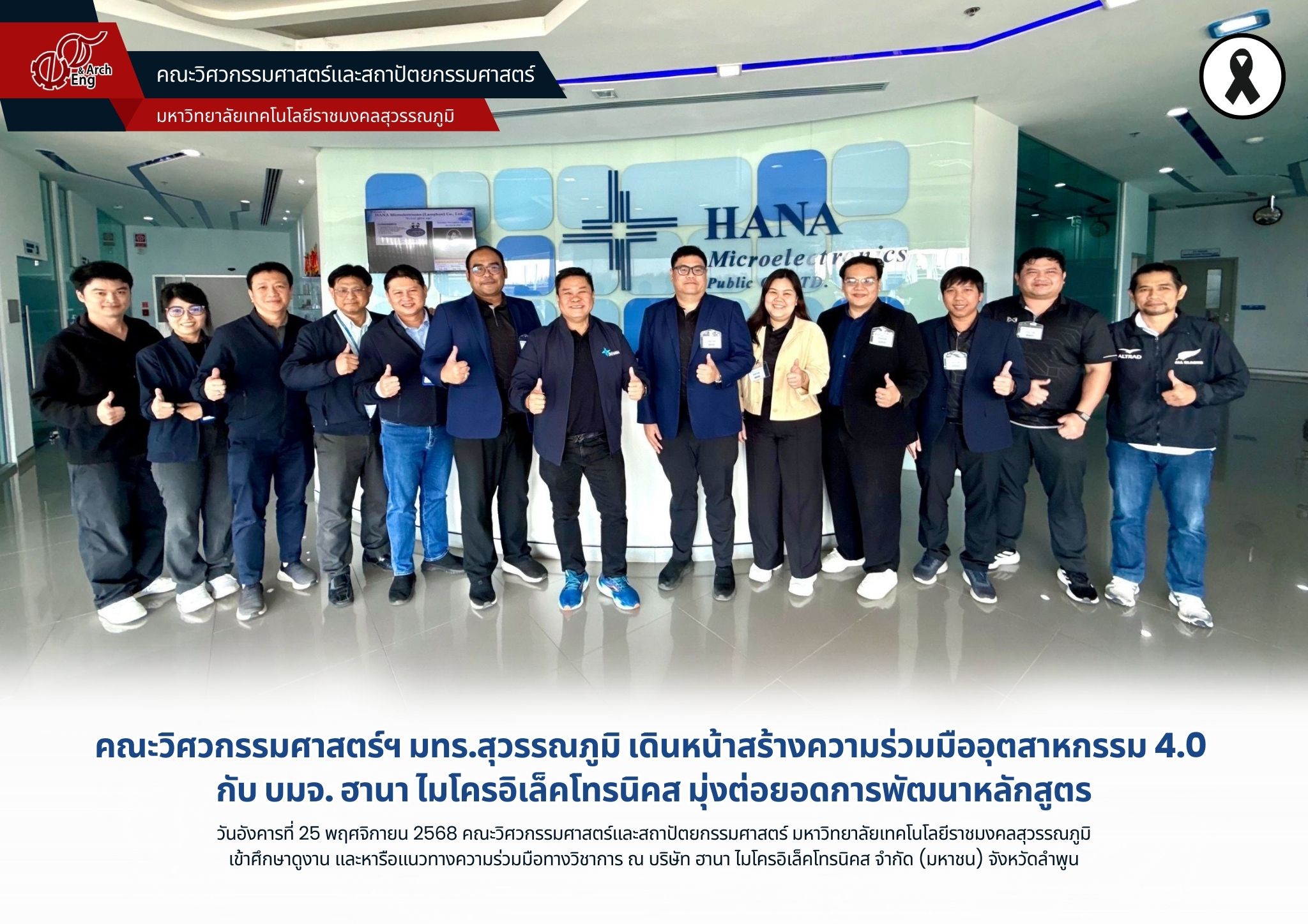 คณะวิศวกรรมศาสตร์ฯ มทร.สุวรรณภูมิ เดินหน้าสร้างความร่วมมืออุตสาหกรรม 4.0 กับ บมจ.ฮานาไมโครอิเล็คโทรนิคส มุ่งต่อยอดการพัฒนาหลักสูตร | ครั้ง เมื่อ 1 สัปดาห์ที่แล้ว