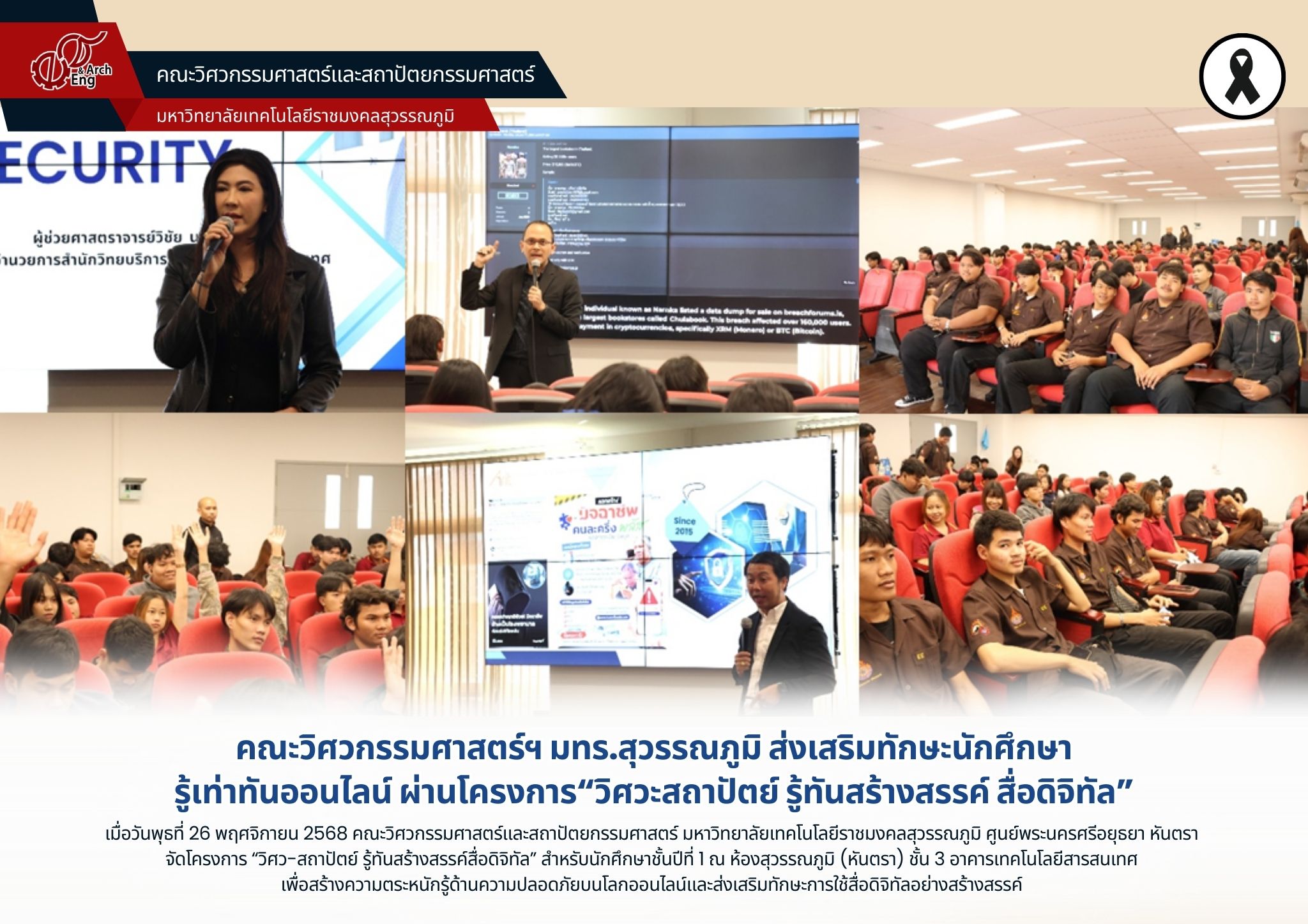 คณะวิศวกรรมศาสตร์ฯ มทร.สุวรรณภูมิ เสริมทักษะนักศึกษา รู้เท่าทันภัยไซเบอร์และใช้สื่อดิจิทัลอย่างสร้างสรรค์ | ครั้ง เมื่อ 6 วันที่แล้ว